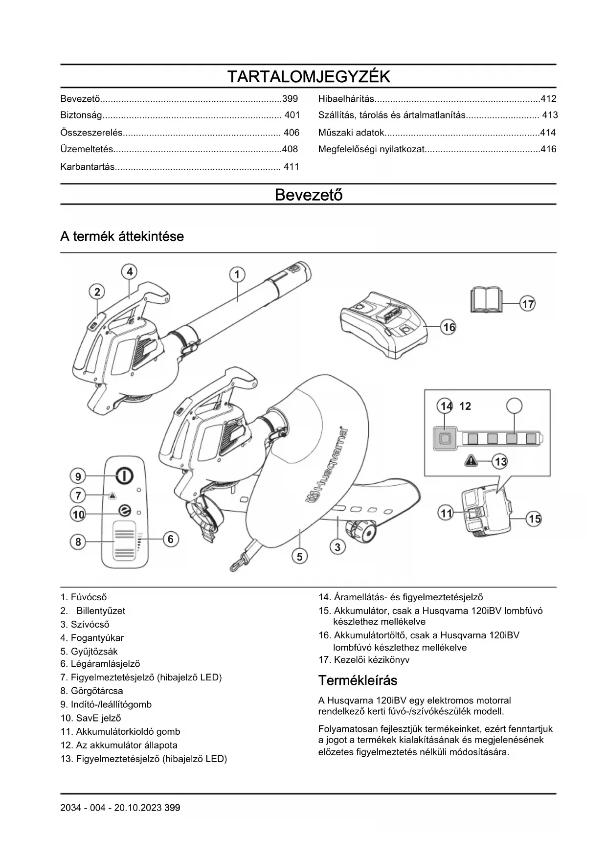 Termékleírás A Husqvarna 120iBV egy elektromos motorral rendelkező kerti fúvó-/szívókészülék modell. Folyamatosan fejlesztjük termékeinket, ezért fenntartjuk a jogot a termékek kialakításának és megjelenésének előzetes figyelmeztetés nélküli módosítására. 2034 - 004 - 20.10.2023 399Rendeltetésszerű használat Fúvó üzemmód: A fúvó üzemmódot arra tervezték, hogy elfújja a szennyeződéseket és a levágott füvet a járdáról, behajtóról, udvarról és hasonló helyekről. Fűnyesedék, szalma vagy falevelek fúvással történő halomba rendezésére, illetve szennyeződések sarkokból, résekből vagy csempék/téglák közötti hézagokból történő eltávolítására is alkalmas. Szívó üzemmód: A szívó üzemmódot száraz anyagok felszívására tervezték. Ide tartoznak a levelek, fű, apró gallyak és papírdarabok. A terméken található jelzések FIGYELMEZTETÉS: A termék veszélyes lehet a kezelőre és másokra, valamint a súlyos sérülésüket és halálukat okozhatja. Körültekintően járjon el, és megfelelően használja a terméket. Olvassa el a használati utasítást, és a termék használatba vétele előtt mindenképpen legyen tisztában a benne foglaltakkal. Használjon jóváhagyott védőszemüveget. Feszültségosztály, V Egyenáram. Az EU és az Egyesült Királyság irányelveinek és jogszabályainak, és New South Wales „Környezetben történő munkavégzés szabályozása (zajszabályozás), 2017” irányelvének megfelelő környezeti zajkibocsátási címke. A termék garantált hangteljesítményszintjére vonatkozó adatok megtalálhatók az alábbi részen: Műszaki adatok414. oldalon és a címkén. Karbantartás előtt válassza le az akkumulátort. A termék és a termék csomagolása nem minősül háztartási hulladéknak. Újrahasznosítását egy elektromos és elektronikus berendezések újrahasznosítására szolgáló ponton kell elvégezni. Ez a termék megfelel a vonatkozó EK- irányelveknek. A termék megfelel a vonatkozó egyesült királyságbeli irányelveknek. Óvja a terméket az esőtől. A termék kikapcsolása után várja meg, amíg a ro- torlapátok leállnak. A terméket csak akkor használja szívó üzemmód- ban, ha a cső teljesen össze van szerelve. A lombfúvó kezelője ügyeljen arra, hogy se ember, se állat ne jöjjön közelebb 15 m-nél. Ha ugyanazon a munkaterületen többen is dolgoz- nak, legalább 15 méteres biztonsá- gi távolságot kell tartani. A lombfúvó nagy erővel fújhat ki tárgyakat, me- lyek visszapattanhatnak. Ez a java- solt biztonsági felszerelés használatá- nak mellőzése esetén súlyos szemsé- rülést okozhat. yyyy wwxxxxx A típustáblán megtalálható a sorozat- szám. éééé a gyártási év, hh pedig a gyártási hét. Megjegyzés: A tartozékon szereplő többi jel/címke egyes piacok specifikus vizsgáztatási követelményeire vonatkozik. Szimbólumok az akkumulátoron, illetve az akkumulátortöltőn A termék újrahasznosítását elektromos és elektronikus be- rendezések újrahasznosításá- ra szolgáló ponton kell elvé- gezni. (Kizárólag Európára vo- natkozik) 400 2034 - 004 - 20.10.2023Meghibásodásbiztos transzformátor. Az akkumulátortöltőt kizárólag beltérben szabad használni és tárolni. Kettős szigetelés. Gyártó Husqvarna AB Drottninggatan 2, SE-561 82 Huskvarna A termék károsodása A termékben keletkezett károkért nem vállalunk felelősséget, amennyiben: