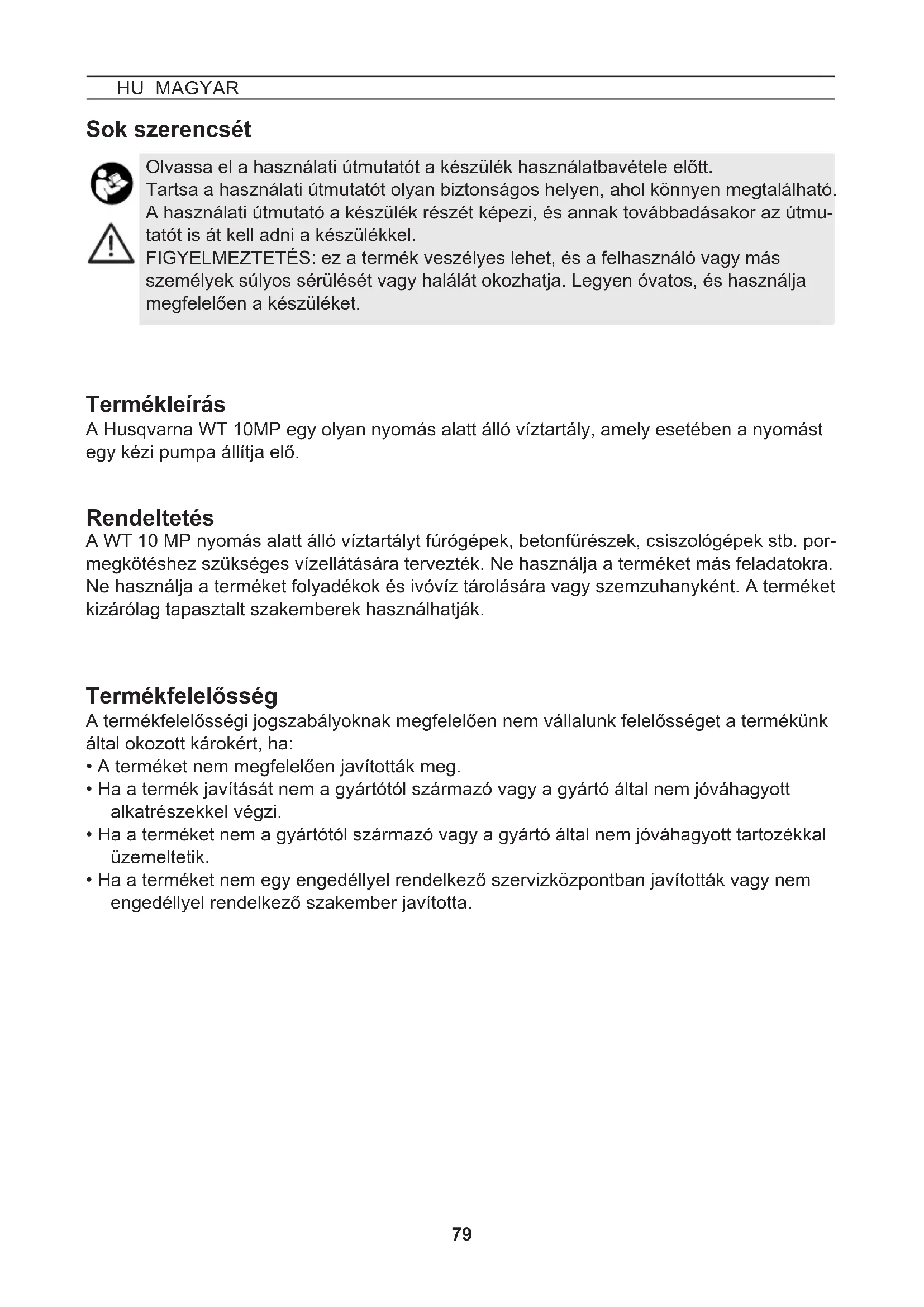 - Zakočite klipnjaču s ručkom [13] i zavijte pumpu [2] u spremnik [1]. (sl. 9)78 79 HR HRVATSKI Izvorni upute EU Izjava o sukladnosti Mi, Husqvarna AB, SE 561 82 Huskvarna, ŠVEDSKA, Tel. +46 36 146500, izjavljujemo da proizvod: Opis Tlačni spremnik Trgovački naziv HUSQVARNA Tip/model WT 10 MP Oznaka Proizvedeno od 2022, naznačeno kao mjesec i godina MMYY Direktiva/Uredba Opis 2006/42/EZ „Direktiva o strojevima“ u potpunosti ispunjava sljedeće direktive i uredbe EU: te da se primjenjuju sljedeći standardi i/ili tehničke specikacije; EN ISO 12100:2010 Partille, 30.11.2022. Fredrik Sandinge R&D Director, Concrete Sawing & Drilling Equipment Husqvarna AB, Construction Division Odgovorni za tehničku dokumentaciju79 HU MAGYAR Sok szerencsét A Husqvarna WT 10MP egy olyan nyomás alatt álló víztartály, amely esetében a nyomást egy kézi pumpa állítja elő. Termékleírás Rendeltetés Olvassa el a használati útmutatót a készülék használatbavétele előtt. Tartsa a használati útmutatót olyan biztonságos helyen, ahol könnyen megtalálható. A használati útmutató a készülék részét képezi, és annak továbbadásakor az útmu- tatót is át kell adni a készülékkel. FIGYELMEZTETÉS: ez a termék veszélyes lehet, és a felhasználó vagy más személyek súlyos sérülését vagy halálát okozhatja. Legyen óvatos, és használja megfelelően a készüléket. A WT 10 MP nyomás alatt álló víztartályt fúrógépek, betonfűrészek, csiszológépek stb. por- megkötéshez szükséges vízellátására tervezték. Ne használja a terméket más feladatokra. Ne használja a terméket folyadékok és ivóvíz tárolására vagy szemzuhanyként. A terméket kizárólag tapasztalt szakemberek használhatják. Termékfelelősség A termékfelelősségi jogszabályoknak megfelelően nem vállalunk felelősséget a termékünk által okozott károkért, ha: