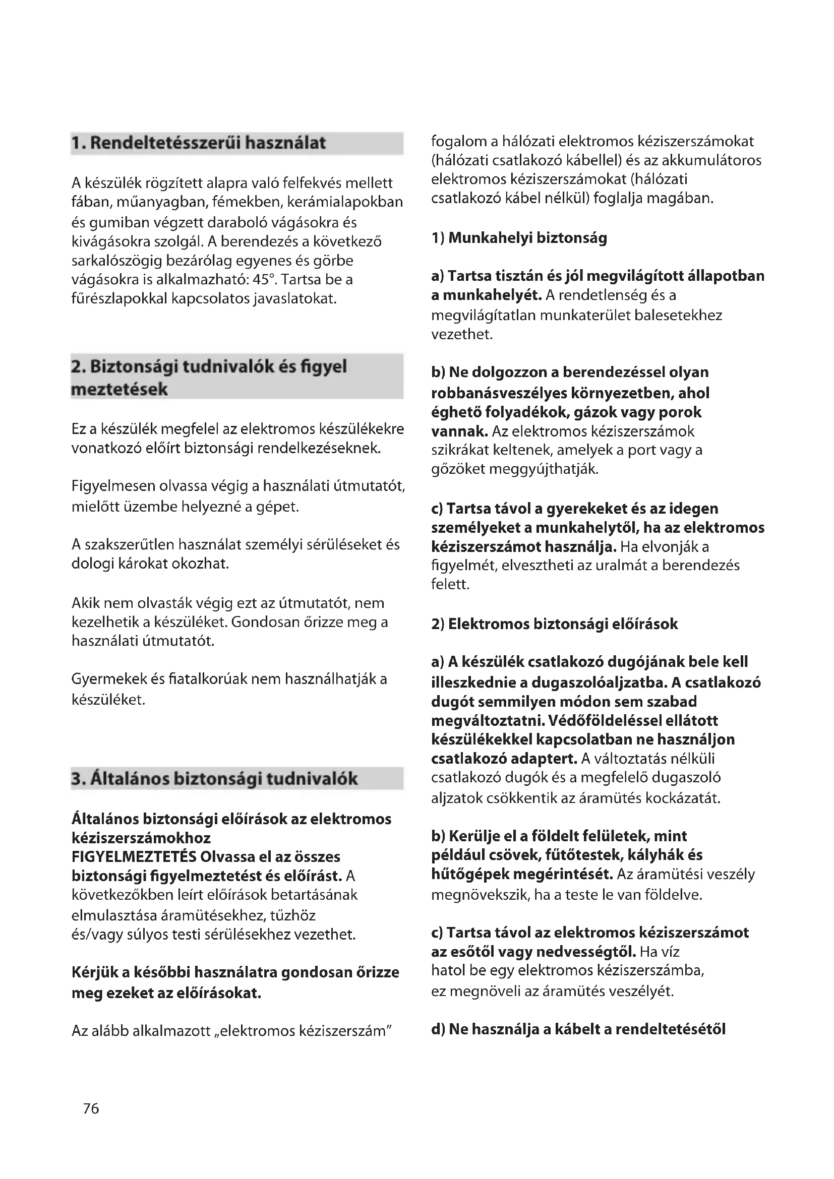 A készülék rögzített alapra való felfekvés mellett fában, műanyagban, fémekben, kerámialapokban és gumiban végzett daraboló vágásokra és kivágásokra szolgál. A berendezés a következő sarkalószögig bezárólag egyenes és görbe vágásokra is alkalmazható: 45°. Tartsa be a fűrészlapokkal kapcsolatos javaslatokat.