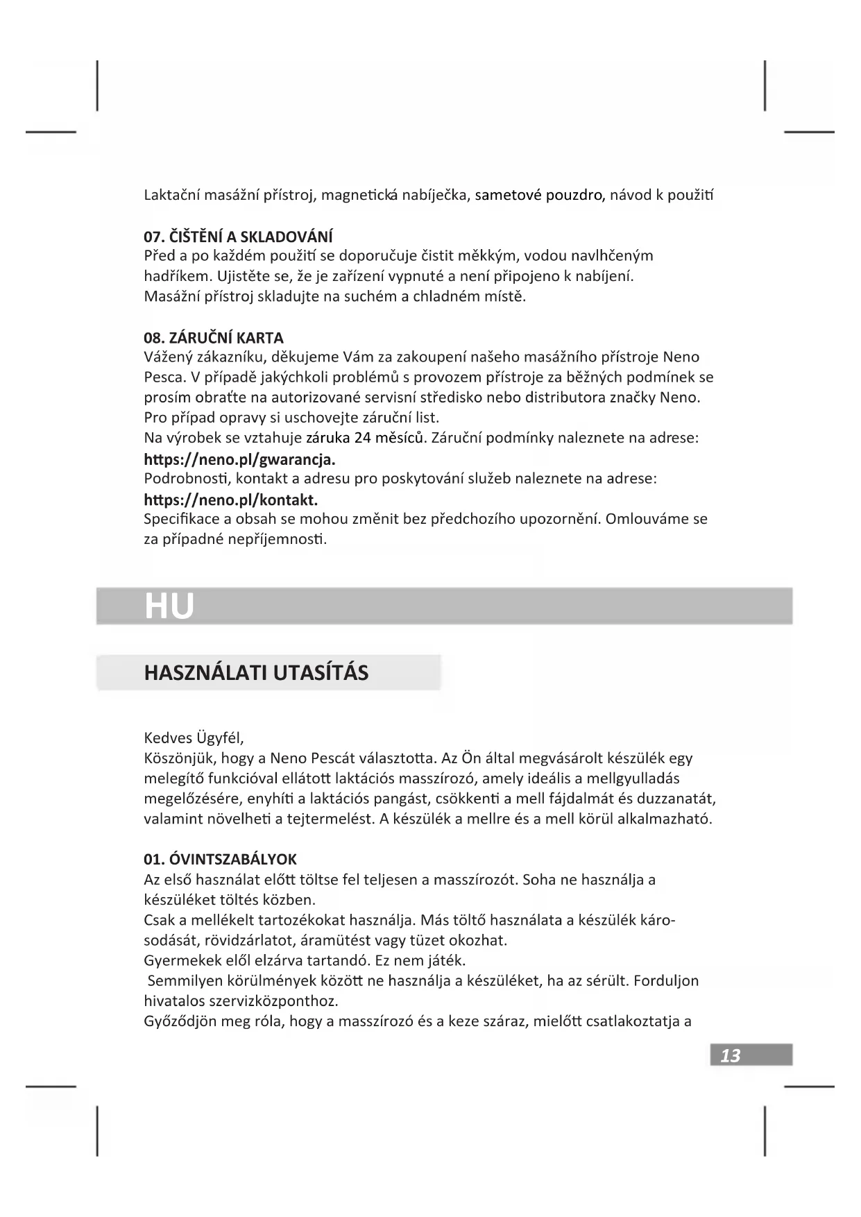 Kedves Ügyfél, köszönjük, hogy megvásárolta Neno Pesca masszírozónkat. Amen- nyiben a készülék normál körülmények közö történő működésével kapcsolatban bármilyen probléma merülne fel, kérjük, forduljon a Neno márka hivatalos szerviz- központjához vagy forgalmazójához. Javítás esetére őrizze meg a jótállási jegyét. A termékre 24 hónapos garancia vonatkozik. A garanciális feltételek a hps://neno.pl/gwarancja oldalon találhatók. Részletek, elérhetőség és a szolgáltatás címe a következő címen található: hps://neno.pl/kontakt A specikációk és a tartalom előzetes értesítés nélkül változhatnak. Elnézést kérünk az esetleges kellemetlenségekért.16