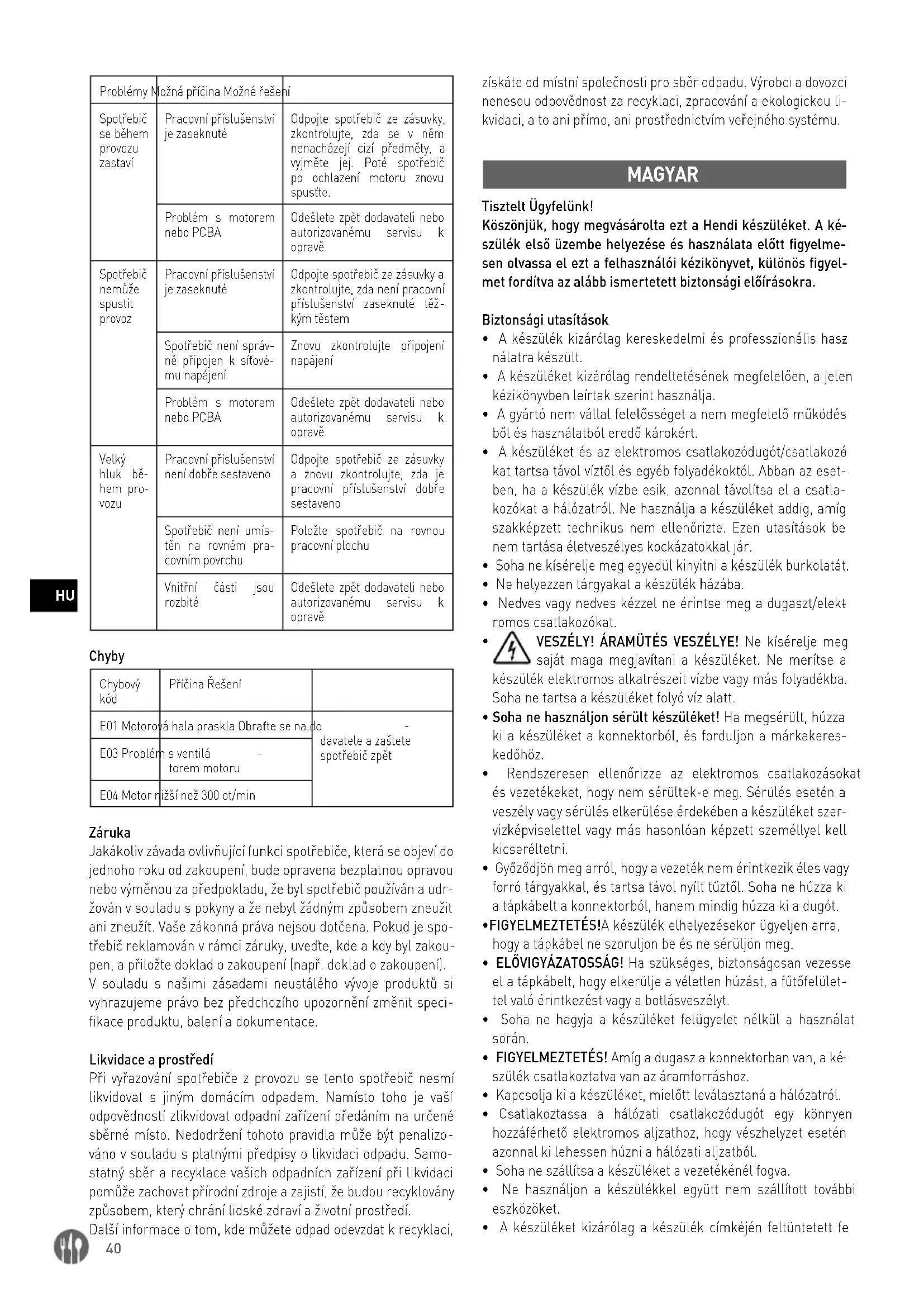 kvidaci, a to ani přímo, ani prostřednictvím veřejného systému. MAGYAR Tisztelt Ügyfelünk! Köszönjük, hogy megvásárolta ezt a Hendi készüléket. A ké