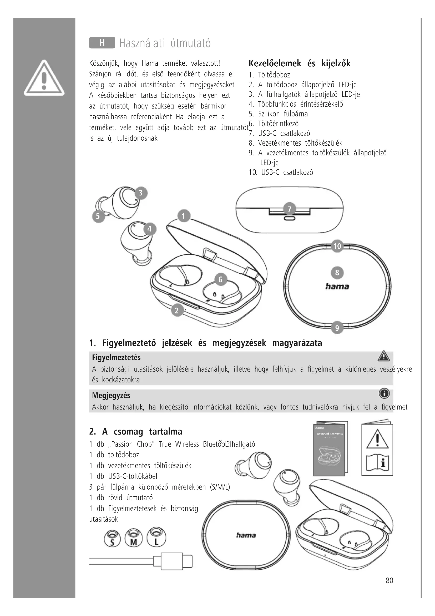 fülhallgató 1 db töltődoboz 1 db vezetékmentes töltőkészülék 1 db USB-C-töltőkábel 3 pár fülpárna különböző méretekben (S/M/L) 1 db rövid útmutató 1 db Figyelmeztetések és biztonsági utasítások H Használati útmutató