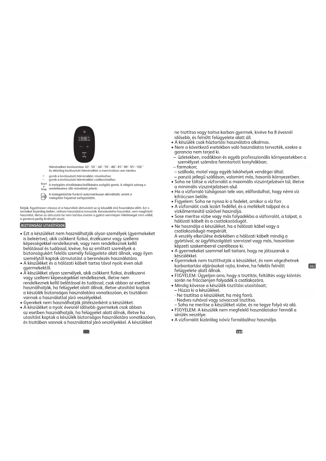 - A készüléket a nyolc évesnél idősebb gyermekek csak abban az esetben használhatják, ha felügyelet alatt állnak, illetve ha utasítást kaptak a készülék biztonságos használatára vonatkozóan, és tisztában vannak a használattal járó veszélyekkel. A készüléket A melegentartás funkció automatikusan aktiválódik, amint a melegítési folyamat befejeződött. Hőmérséklet kiválasztása: 40°- 50 °- 60°- 70°- -80°- 85°- 90°- 95°- 100 ° Az előzőleg kiválasztott hőmérséklet a memóriában van tárolva. gomb a kiválasztott hőmérséklet növeléséhez gomb a kiválasztott hőmérséklet csökkentéséhez A melegítés elindítására/leállítására szolgáló gomb. A világító szöveg a rendelkezésre álló műveletet jelenti. ne tisztítsa vagy tartsa karban gyermek, kivéve ha 8 évesnél idősebb, és felnőtt felügyelete alatt áll.