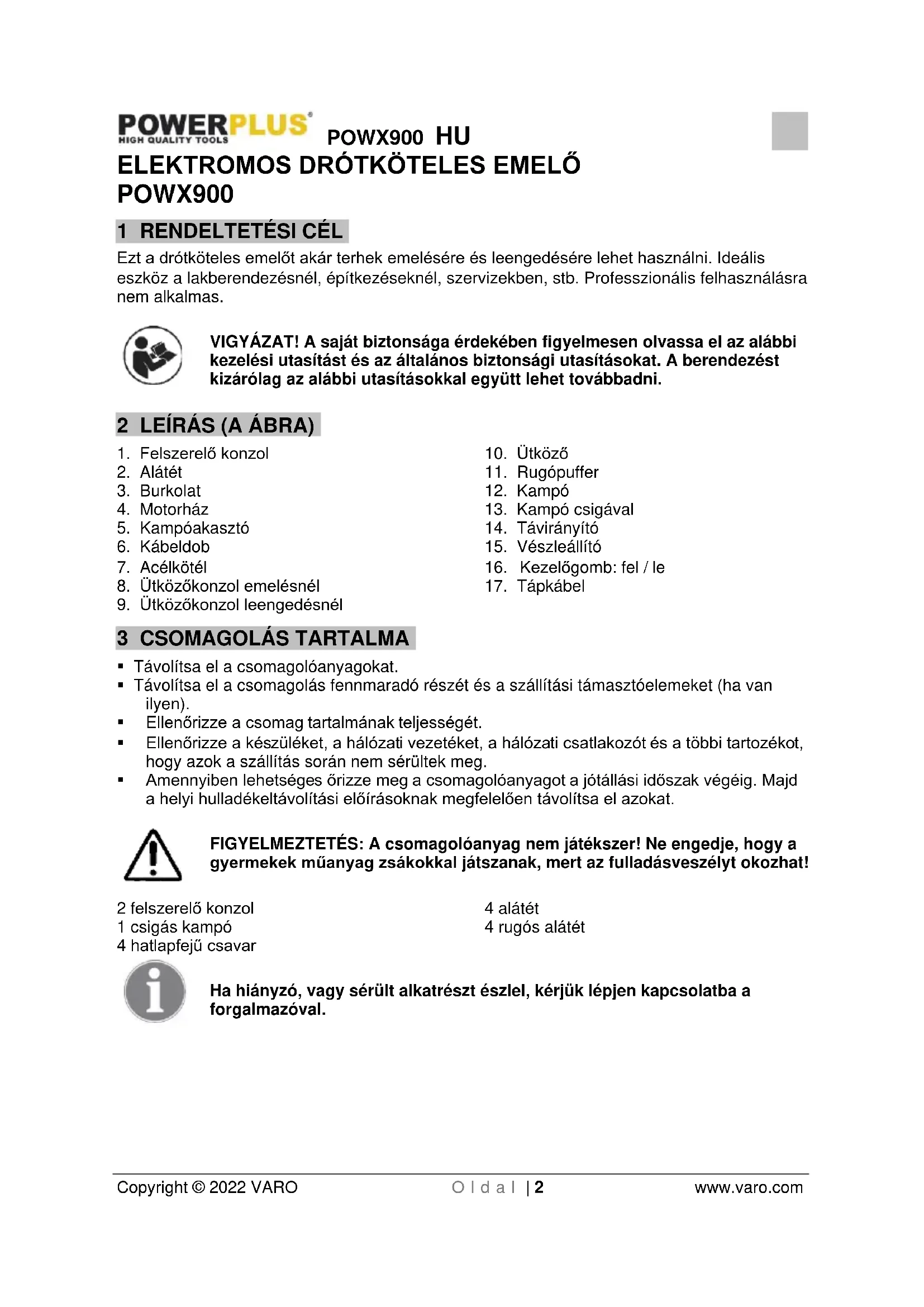 - A véghelyzet-kapcsolót nem szabad kezelőgombként használni és nem szabad azt leszerelni. A véghelyzet-kapcsoló egy biztonsági eszköz annak érdekében, hogy megakadályozza a teher határon túli felemelését.POWX900 HU Copyright © 2022 VARO O l d a l | 6 www.varo.com