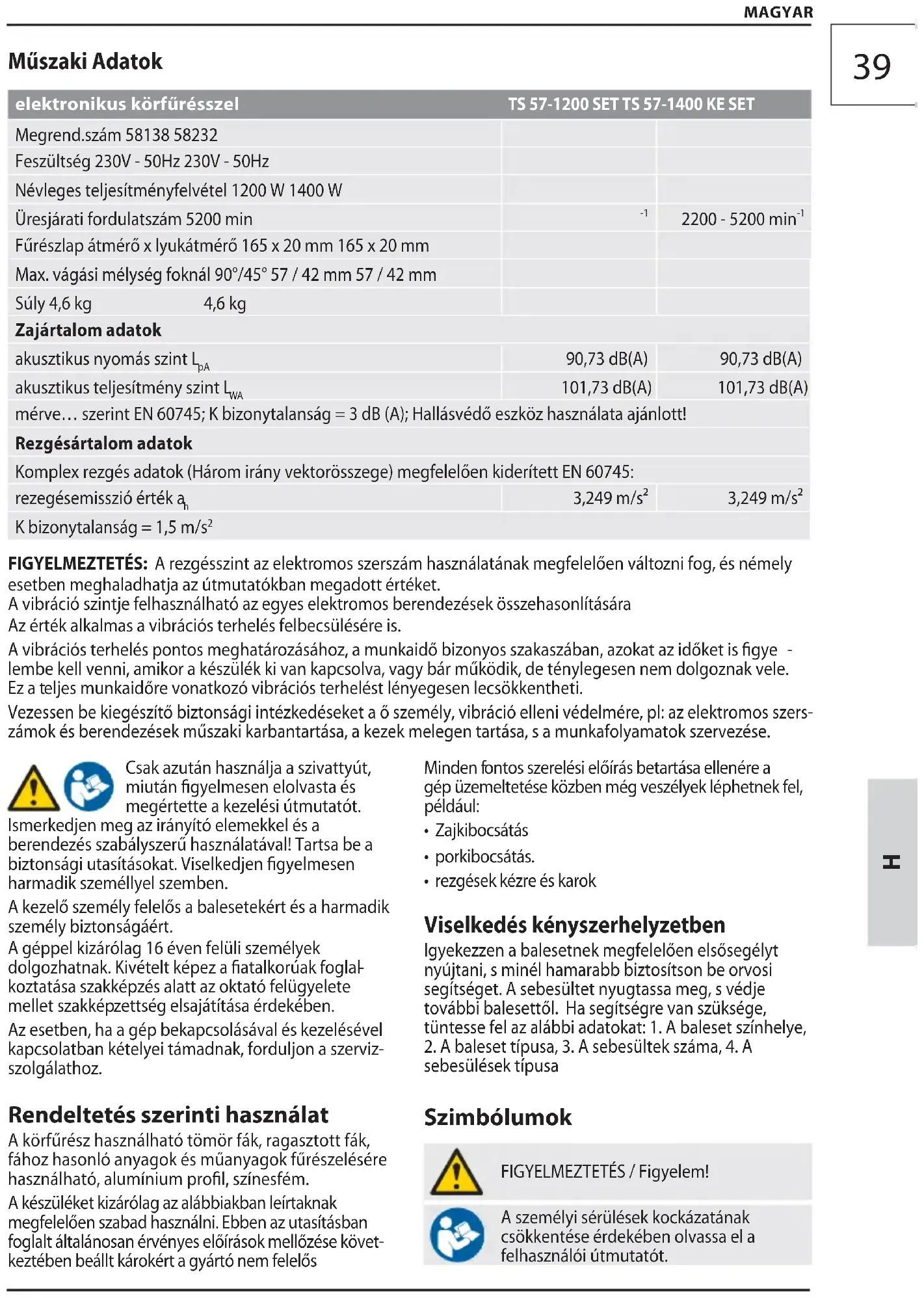 MAGYAR Műszaki Adatok elektronikus körfűrésszel TS 57-1200 SET TS 57-1400 KE SET Megrend.szám 58138 58232 Feszültség 230V - 50Hz 230V - 50Hz Névleges teljesítményfelvétel 1200 W 1400 W Üresjárati fordulatszám 5200 min