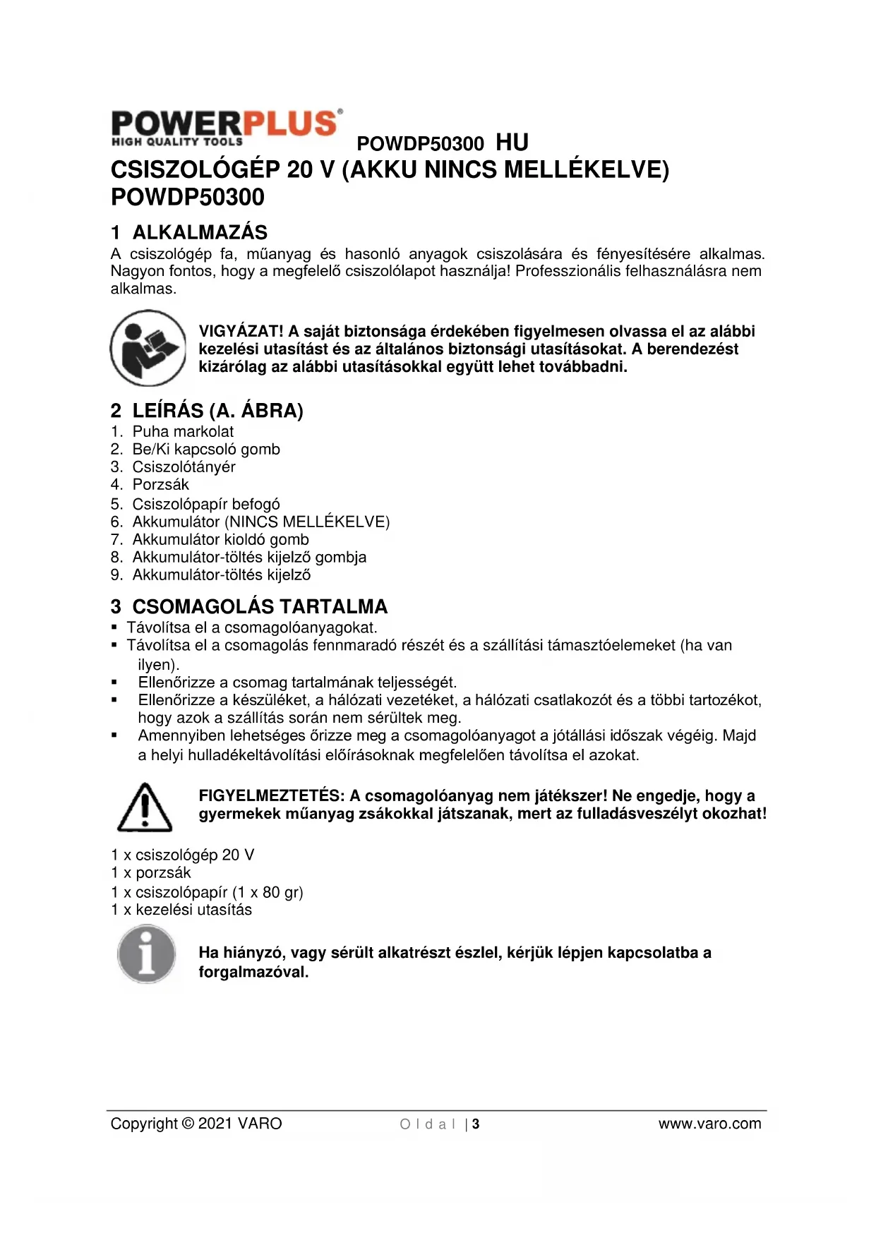 Copyright © 2021 VARO O l d a l | 3 www.varo.com CSISZOLÓGÉP 20 V (AKKU NINCS MELLÉKELVE) POWDP50300 1 ALKALMAZÁS A csiszológép fa, műanyag és hasonló anyagok csiszolására és fényesítésére alkalmas. Nagyon fontos, hogy a megfelelő csiszolólapot használja! Professzionális felhasználásra nem alkalmas. VIGYÁZAT! A saját biztonsága érdekében figyelmesen olvassa el az alábbi kezelési utasítást és az általános biztonsági utasításokat. A berendezést kizárólag az alábbi utasításokkal együtt lehet továbbadni. 2 LEÍRÁS (A. ÁBRA)