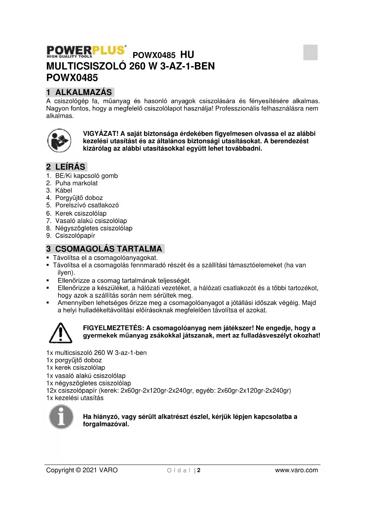 Távolítsa el a csomagolóanyagokat. Távolítsa el a csomagolás fennmaradó részét és a szállítási támasztóelemeket (ha van ilyen). Ellenőrizze a csomag tartalmának teljességét. Ellenőrizze a készüléket, a hálózati vezetéket, a hálózati csatlakozót és a többi tartozékot, hogy azok a szállítás során nem sérültek meg. Amennyiben lehetséges őrizze meg a csomagolóanyagot a jótállási időszak végéig. Majd a helyi hulladékeltávolítási előírásoknak megfelelően távolítsa el azokat. FIGYELMEZTETÉS: A csomagolóanyag nem játékszer! Ne engedje, hogy a gyermekek műanyag zsákokkal játszanak, mert az fulladásveszélyt okozhat! 1x multicsiszoló 260 W 3-az-1-ben 1x porgyűjtő doboz 1x kerek csiszolólap 1x vasaló alakú csiszolólap 1x négyszögletes csiszolólap 12x csiszolópapír (kerek: 2x60gr-2x120gr-2x240gr, egyéb: 2x60gr-2x120gr-2x240gr) 1x kezelési utasítás Ha hiányzó, vagy sérült alkatrészt észlel, kérjük lépjen kapcsolatba a forgalmazóval.POWX0485 HU Copyright © 2021 VARO O l d a l | 3 www.varo.com 4 JELZÉSEK A jelen kezelési utasításban és/vagy a készüléken a következő jelzéseket alkalmaztuk: