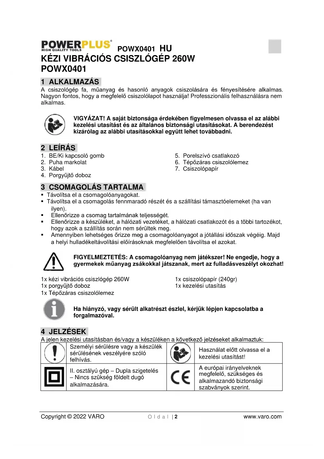 Copyright © 2022 VARO O l d a l | 2 www.varo.com KÉZI VIBRÁCIÓS CSISZLÓGÉP 260W POWX0401 1 ALKALMAZÁS A csiszológép fa, műanyag és hasonló anyagok csiszolására és fényesítésére alkalmas. Nagyon fontos, hogy a megfelelő csiszolólapot használja! Professzionális felhasználásra nem alkalmas. VIGYÁZAT! A saját biztonsága érdekében figyelmesen olvassa el az alábbi kezelési utasítást és az általános biztonsági utasításokat. A berendezést kizárólag az alábbi utasításokkal együtt lehet továbbadni.