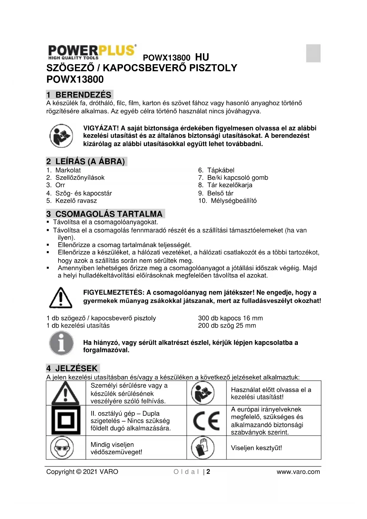 - A vásárlási szelvényt a vásárlás időpontjának bizonyításához meg kell őrizni.POWX13800 HU Copyright © 2021 VARO O l d a l | 8 www.varo.com
