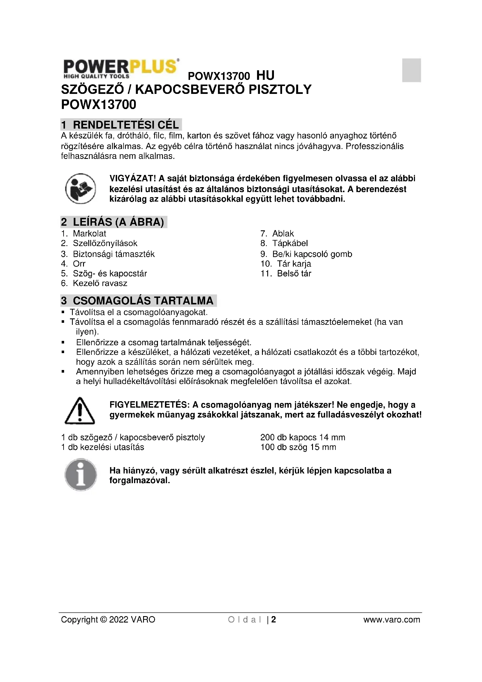 - Az elektromos működtetésű szerszámokat, tartozékokat, betéteket az utasításoknak és az adott típusú eszköznek megfelelően használja, figyelembe véve a munkafeltételeket és a végrehajtandó tevékenységet. Az elektromos működtetésű szerszámok rendeltetéstől eltérő használata veszélyes helyzetekhez vezethet.POWX13700 HU Copyright © 2022 VARO O l d a l | 5 www.varo.com