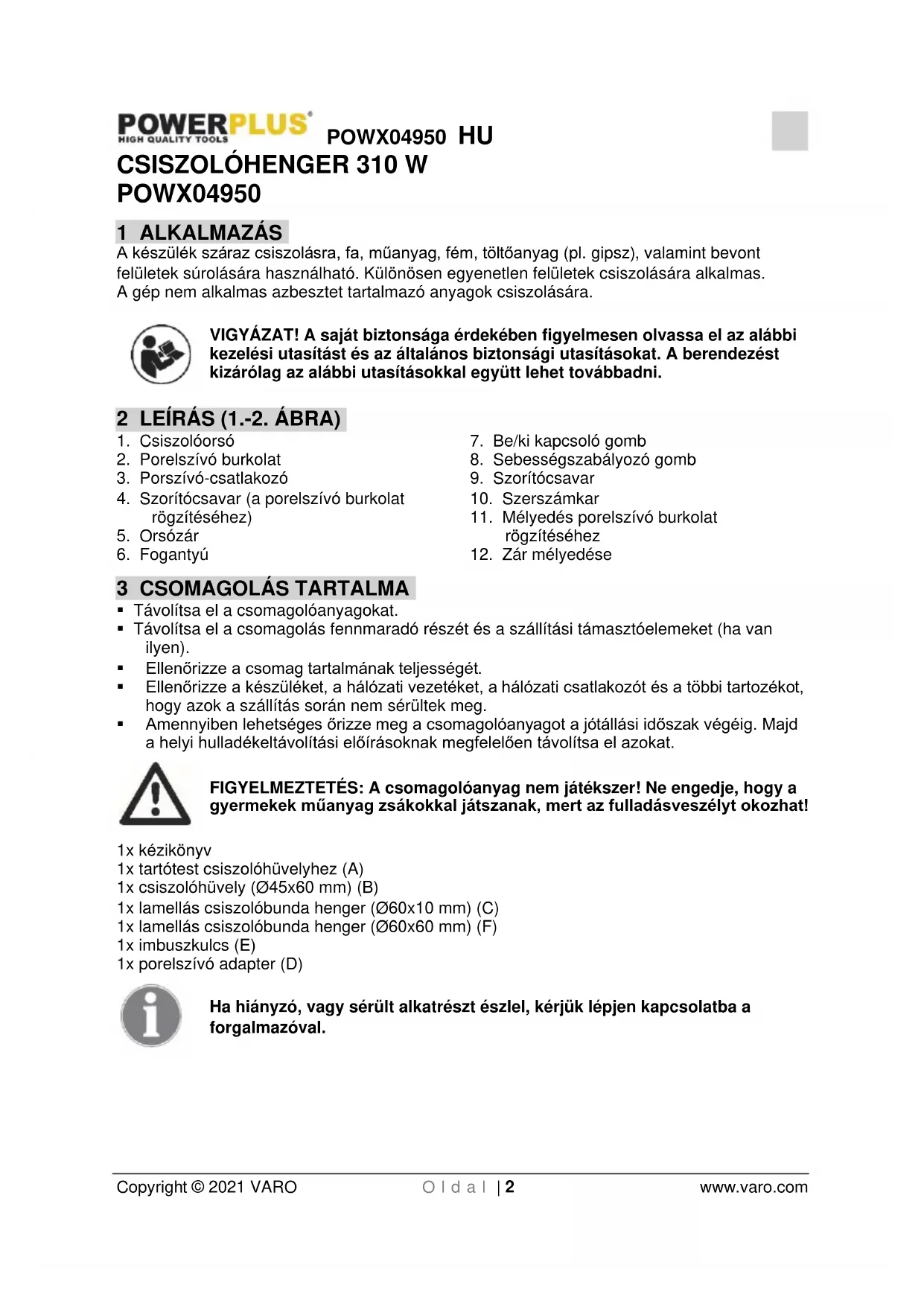 Távolítsa el a csomagolóanyagokat. Távolítsa el a csomagolás fennmaradó részét és a szállítási támasztóelemeket (ha van ilyen). Ellenőrizze a csomag tartalmának teljességét. Ellenőrizze a készüléket, a hálózati vezetéket, a hálózati csatlakozót és a többi tartozékot, hogy azok a szállítás során nem sérültek meg. Amennyiben lehetséges őrizze meg a csomagolóanyagot a jótállási időszak végéig. Majd a helyi hulladékeltávolítási előírásoknak megfelelően távolítsa el azokat. FIGYELMEZTETÉS: A csomagolóanyag nem játékszer! Ne engedje, hogy a gyermekek műanyag zsákokkal játszanak, mert az fulladásveszélyt okozhat! 1x kézikönyv 1x tartótest csiszolóhüvelyhez (A) 1x csiszolóhüvely (Ø45x60 mm) (B) 1x lamellás csiszolóbunda henger (Ø60x10 mm) (C) 1x lamellás csiszolóbunda henger (Ø60x60 mm) (F) 1x imbuszkulcs (E) 1x porelszívó adapter (D) Ha hiányzó, vagy sérült alkatrészt észlel, kérjük lépjen kapcsolatba a forgalmazóval.POWX04950 HU Copyright © 2021 VARO O l d a l | 3 www.varo.com 4 JELZÉSEK A jelen kézikönyvben és/vagy a gépen az alábbi jelzéseket használtuk: