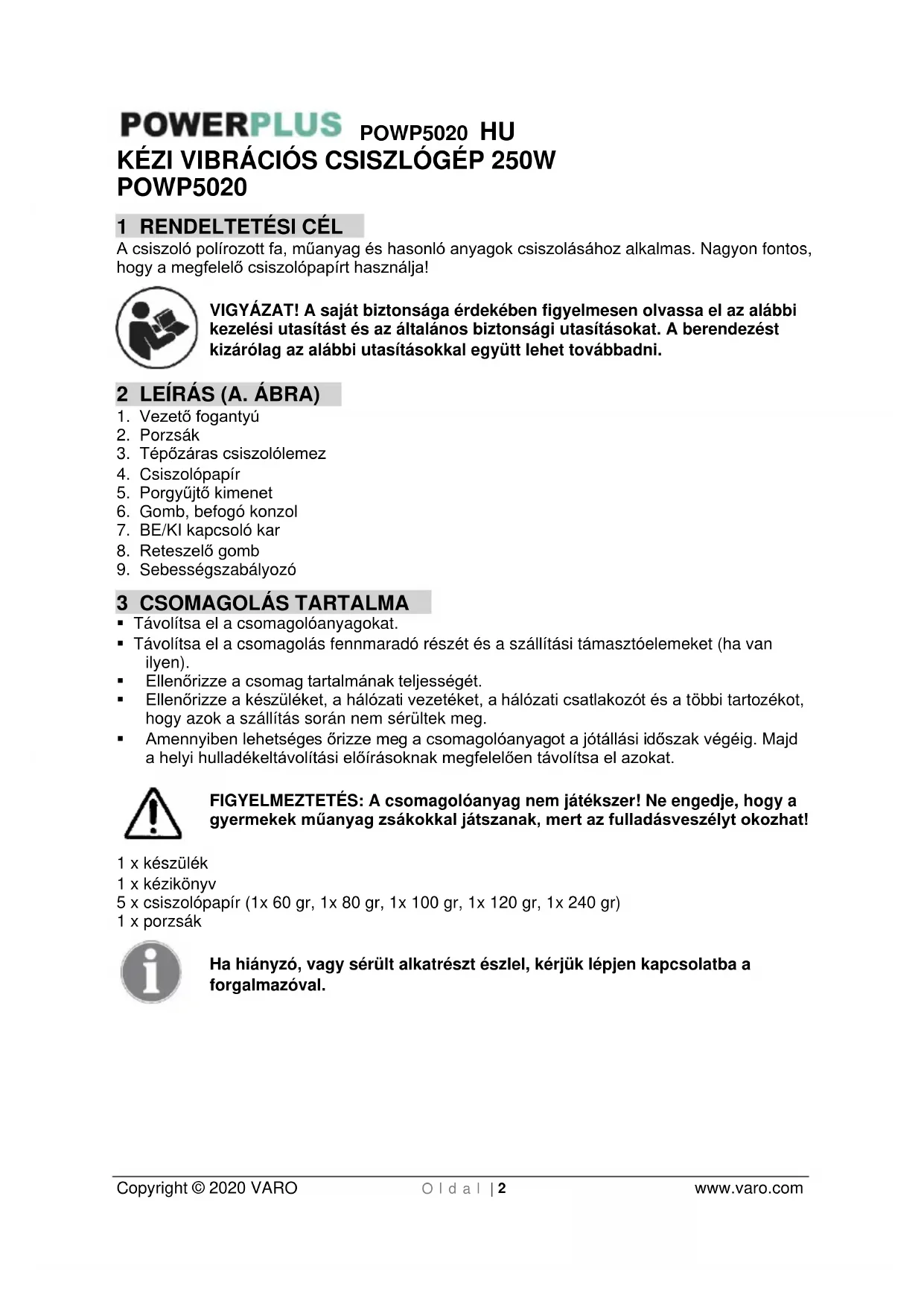 - Amennyiben lehetséges őrizze meg a csomagolóanyagot a jótállási időszak végéig. Majd a helyi hulladékeltávolítási előírásoknak megfelelően távolítsa el azokat. FIGYELMEZTETÉS: A csomagolóanyag nem játékszer! Ne engedje, hogy a gyermekek műanyag zsákokkal játszanak, mert az fulladásveszélyt okozhat! 1 x készülék 1 x kézikönyv 5 x csiszolópapír (1x 60 gr, 1x 80 gr, 1x 100 gr, 1x 120 gr, 1x 240 gr) 1 x porzsák Ha hiányzó, vagy sérült alkatrészt észlel, kérjük lépjen kapcsolatba a forgalmazóval.POWP5020 HU Copyright © 2020 VARO O l d a l | 3 www.varo.com 4 JELZÉSEK A jelen kezelési utasításban és/vagy a készüléken a következő jelzéseket alkalmaztuk: