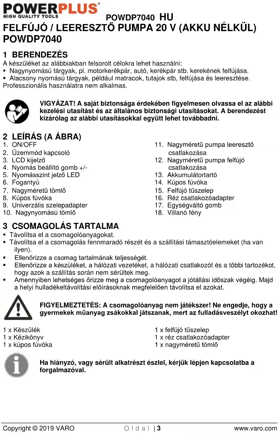Copyright © 2019 VARO O l d a l | 3 www.varo.com FELFÚJÓ / LEERESZTŐ PUMPA 20 V (AKKU NÉLKÜL) POWDP7040 1 BERENDEZÉS A készüléket az alábbiakban felsorolt célokra lehet használni: