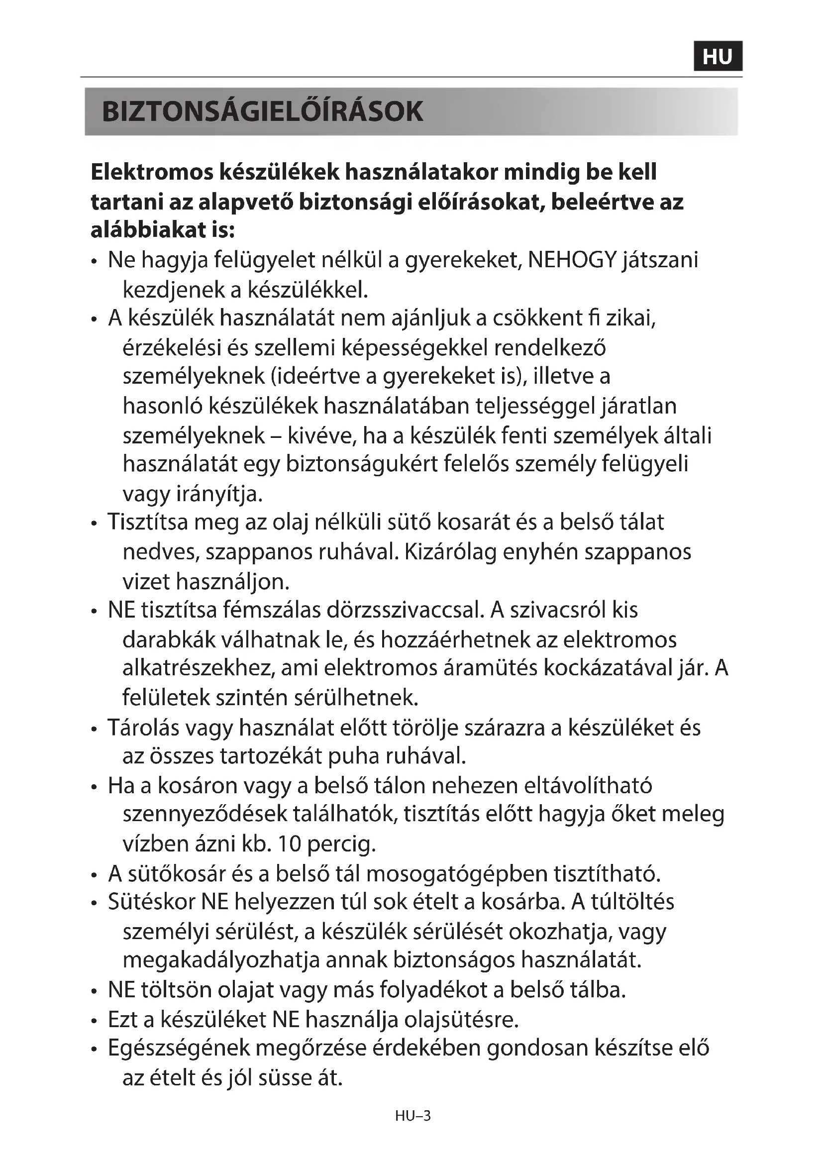 AZ OLAJ NÉLKÜLI SÜTŐ HASZNÁLATA ELŐTT Az olaj nélküli sütő használatba vétele előtt ajánlott, hogy a teljes kicsomagolás, valamint a belső tál és a sütőkosár csomagolóanyagának eltávolítása után a belső tálat és a sütőkosarat forró szappanos vízzel vagy mosogatógépben mossa el. Ezután alaposan szárítsa meg az összes tartozékot, és szerelje vissza az olaj nélküli sütőbe. Használat előtt törölje át a külső burkolatot és a belső részeket nedves ruhával és szárítsa meg. Dugja be a csatlakozót a konnektorba, és készen áll az új olaj nélküli sütő használatára.Használat előtt ajánlatos ennek az útmutatónak a végig olvasása.HU–10 HU–10