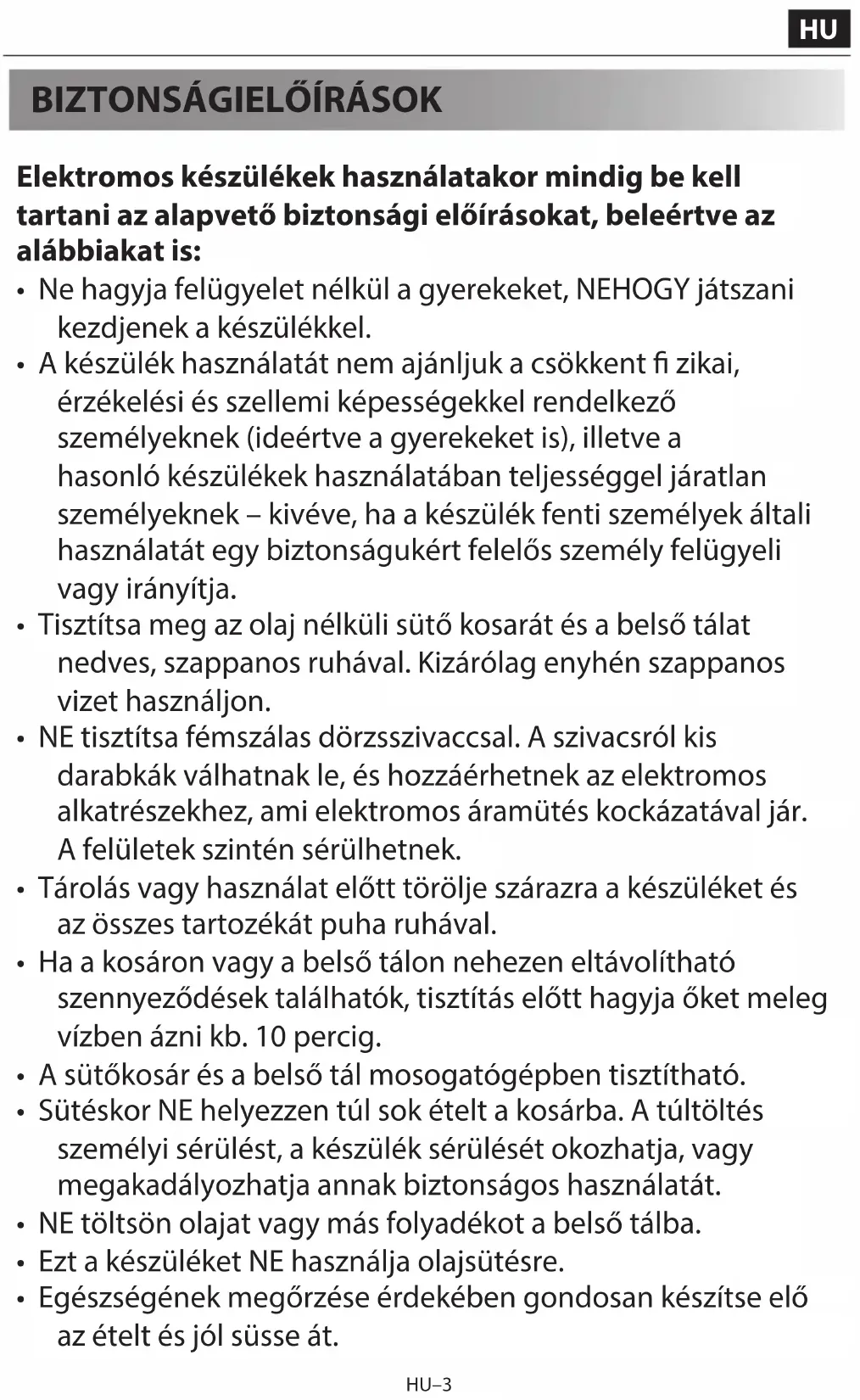 AZ OLAJ NÉLKÜLI SÜTŐ HASZNÁLATA ELŐTT Az olaj nélküli sütő használatba vétele előtt ajánlott, hogy a teljes kicsomagolás, valamint a belső tál és a sütőkosár csomagolóanyagának eltávolítása után a belső tálat és a sütőkosarat forró szappanos vízzel vagy mosogatógépben mossa el. Ezután alaposan szárítsa meg az összes tartozékot, és szerelje vissza az olaj nélküli sütőbe. Használat előtt törölje át a külső burkolatot és a belső részeket nedves ruhával és szárítsa meg. Dugja be a csatlakozót a konnektorba, és készen áll az új olaj nélküli sütő használatára.Használat előtt ajánlatos ennek az útmutatónak a végig olvasása.HU–10 HU–10