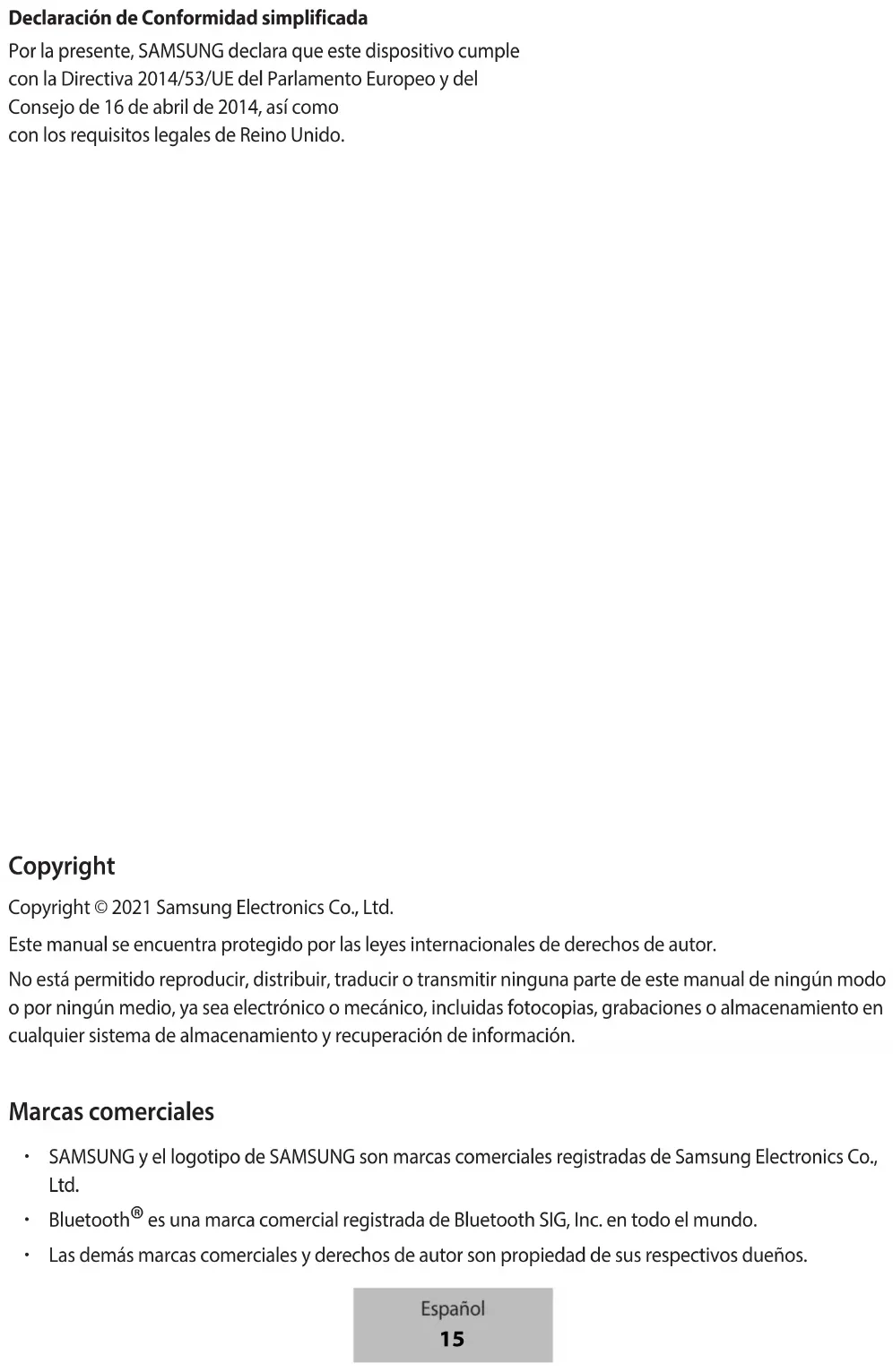 A Samsung semmiféle olyan kárért vagy veszteségért nem vállal felelősséget (sem szerződéses, sem felelősségjogi alapon, beleértve ebbe a gondatlanság tényállását), amely abból ered, hogy ezen figyelmeztetéseket és utasításokat nem követték pontosan. Magyar 14Szerzői jog Copyright © 2021 Samsung Electronics Co., Ltd. Ezt az útmutatót nemzetközi szerzői jogi törvények védik. A használati útmutató egyetlen része sem reprodukálható, terjeszthető, fordítható le vagy küldhető el semmilyen formában és semmilyen elektronikus vagy mechanikus eszközzel, beleértve a fénymásolást, a hangfelvételt, a különféle adattároló eszközökön való tárolást és az azokról történő lekérést. Védjegyek