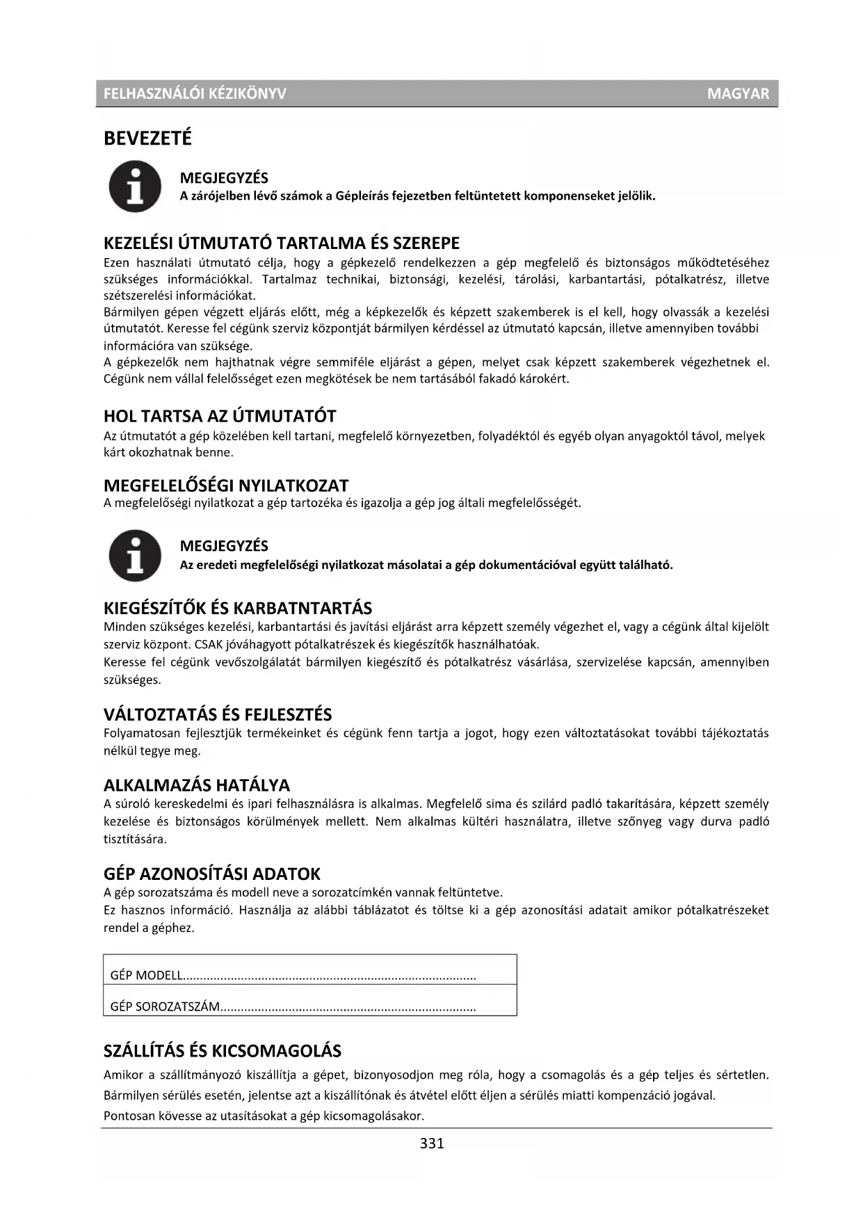 A gép sorozatszáma és modell neve a sorozatcímkén vannak feltüntetve. Ez hasznos információ. Használja az alábbi táblázatot és töltse ki a gép azonosítási adatait amikor pótalkatrészeket rendel a géphez. GÉP MODELL...................................................................................... GÉP SOROZATSZÁM........................................................................... SZÁLLÍTÁS ÉS KICSOMAGOLÁS Amikor a szállítmányozó kiszállítja a gépet, bizonyosodjon meg róla, hogy a csomagolás és a gép teljes és sértetlen. Bármilyen sérülés esetén, jelentse azt a kiszállítónak és átvétel előtt éljen a sérülés miatti kompenzáció jogával. Pontosan kövesse az utasításokat a gép kicsomagolásakor.