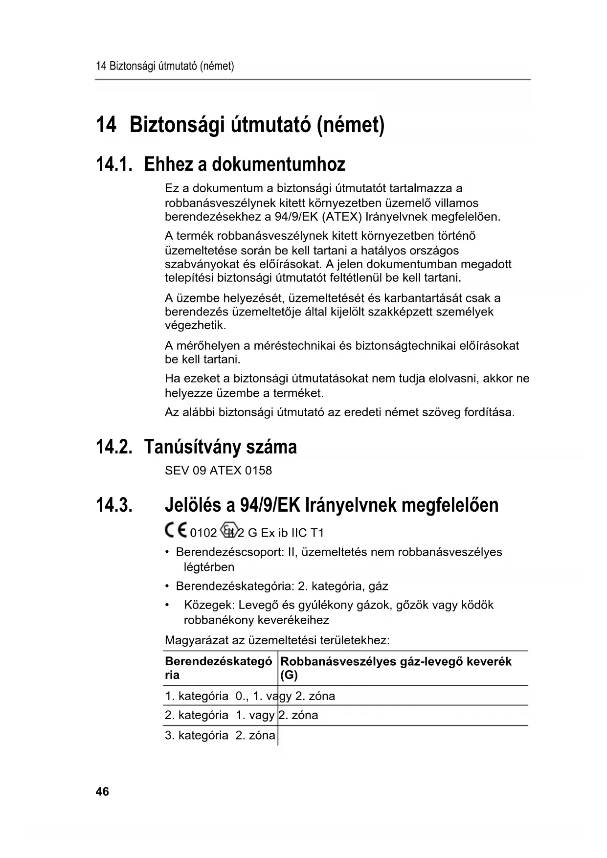 14 Biztonsági útmutató (német) 14.1. Ehhez a dokumentumhoz Ez a dokumentum a biztonsági útmutatót tartalmazza a robbanásveszélynek kitett környezetben üzemelő villamos berendezésekhez a 94/9/EK (ATEX) Irányelvnek megfelelően. A termék robbanásveszélynek kitett környezetben történő üzemeltetése során be kell tartani a hatályos országos szabványokat és előírásokat. A jelen dokumentumban megadott telepítési biztonsági útmutatót feltétlenül be kell tartani. A üzembe helyezését, üzemeltetését és karbantartását csak a berendezés üzemeltetője által kijelölt szakképzett személyek végezhetik. A mérőhelyen a méréstechnikai és biztonságtechnikai előírásokat be kell tartani. Ha ezeket a biztonsági útmutatásokat nem tudja elolvasni, akkor ne helyezze üzembe a terméket. Az alábbi biztonsági útmutató az eredeti német szöveg fordítása. 14.2. Tanúsítvány száma SEV 09 ATEX 0158 14.3. Jelölés a 94/9/EK Irányelvnek megfelelően 0102 II 2 G Ex ib IIC T1