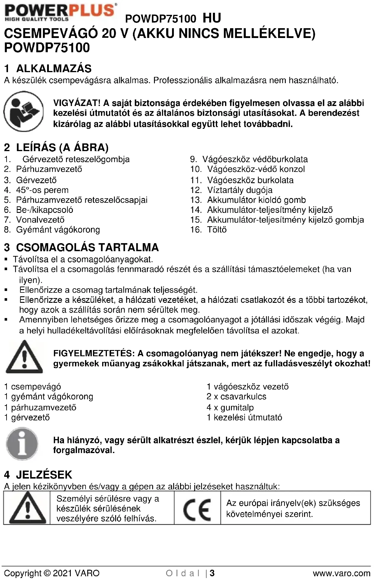 Az európai irányelv(ek) szükséges követelményei szerint.POWDP75100 HU Copyright © 2021 VARO O l d a l | 4 www.varo.com