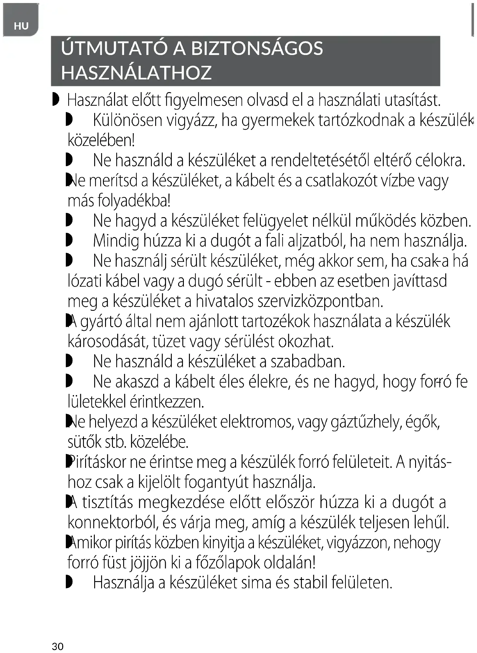 Amikor pirítás közben kinyitja a készüléket, vigyázzon, nehogy forró füst jöjjön ki a főzőlapok oldalán! Használja a készüléket sima és stabil felületen.31