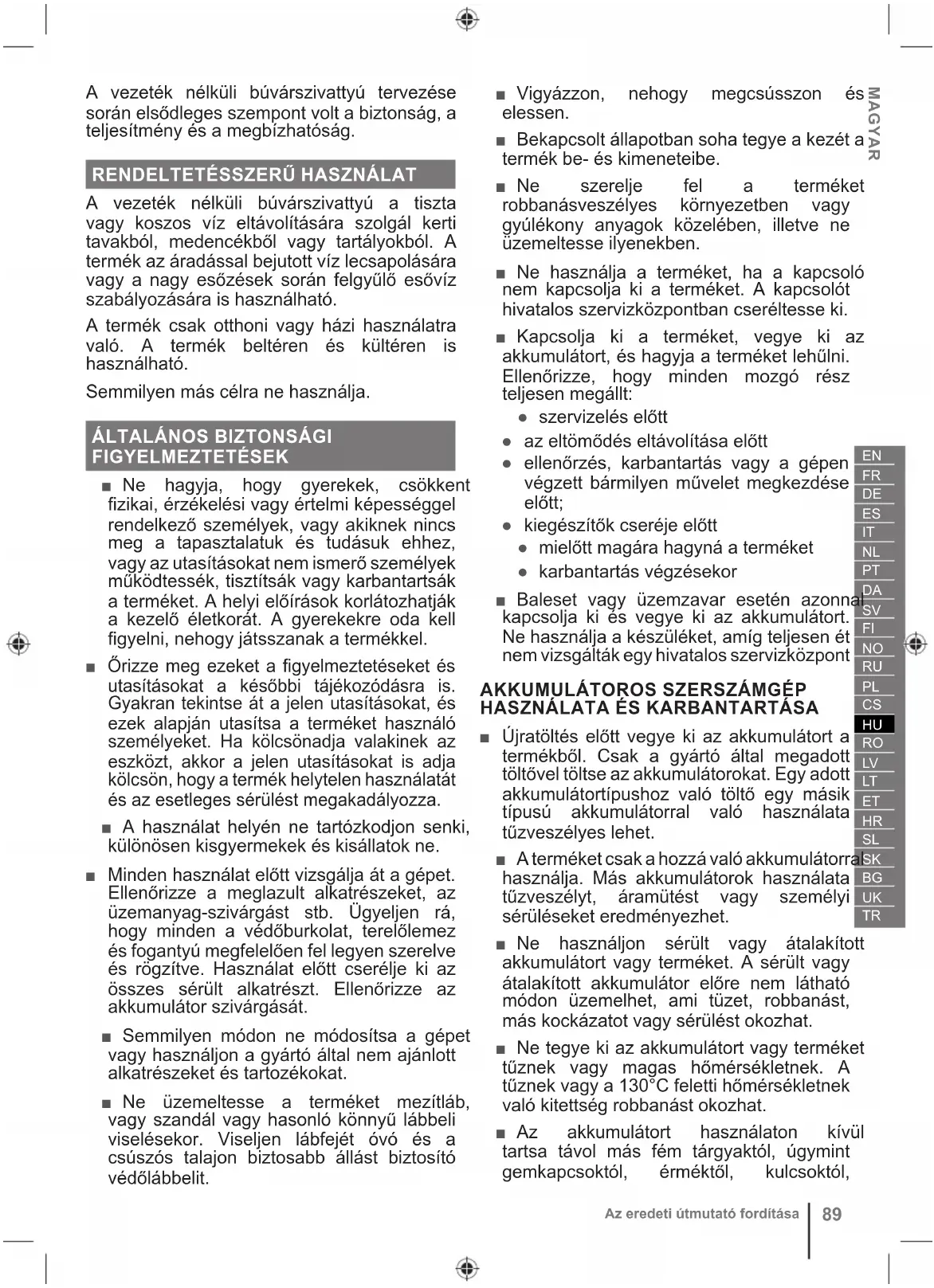 FIGYELMEZTETÉSEK ■ Ne hagyja, hogy gyerekek, csökkent fizikai, érzékelési vagy értelmi képességgel rendelkező személyek, vagy akiknek nincs meg a tapasztalatuk és tudásuk ehhez, vagy az utasításokat nem ismerő személyek működtessék, tisztítsák vagy karbantartsák a terméket. A helyi előírások korlátozhatják a kezelő életkorát. A gyerekekre oda kell figyelni, nehogy játsszanak a termékkel. ■ Őrizze meg ezeket a figyelmeztetéseket és utasításokat a későbbi tájékozódásra is. Gyakran tekintse át a jelen utasításokat, és ezek alapján utasítsa a terméket használó személyeket. Ha kölcsönadja valakinek az eszközt, akkor a jelen utasításokat is adja kölcsön, hogy a termék helytelen használatát és az esetleges sérülést megakadályozza. ■ A használat helyén ne tartózkodjon senki, különösen kisgyermekek és kisállatok ne. ■ Minden használat előtt vizsgálja át a gépet. Ellenőrizze a meglazult alkatrészeket, az üzemanyag-szivárgást stb. Ügyeljen rá, hogy minden a védőburkolat, terelőlemez és fogantyú megfelelően fel legyen szerelve és rögzítve. Használat előtt cserélje ki az összes sérült alkatrészt. Ellenőrizze az akkumulátor szivárgását. ■ Semmilyen módon ne módosítsa a gépet vagy használjon a gyártó által nem ajánlott alkatrészeket és tartozékokat. ■ Ne üzemeltesse a terméket mezítláb, vagy szandál vagy hasonló könnyű lábbeli viselésekor. Viseljen lábfejét óvó és a csúszós talajon biztosabb állást biztosító védőlábbelit. ■ Vigyázzon, nehogy megcsússzon és elessen. ■ Bekapcsolt állapotban soha tegye a kezét a termék be- és kimeneteibe. ■ Ne szerelje fel a terméket robbanásveszélyes környezetben vagy gyúlékony anyagok közelében, illetve ne üzemeltesse ilyenekben. ■ Ne használja a terméket, ha a kapcsoló nem kapcsolja ki a terméket. A kapcsolót hivatalos szervizközpontban cseréltesse ki. ■ Kapcsolja ki a terméket, vegye ki az akkumulátort, és hagyja a terméket lehűlni. Ellenőrizze, hogy minden mozgó rész teljesen megállt: ● szervizelés előtt ● az eltömődés eltávolítása előtt ● ellenőrzés, karbantartás vagy a gépen végzett bármilyen művelet megkezdése előtt; ● kiegészítők cseréje előtt ● mielőtt magára hagyná a terméket ● karbantartás végzésekor ■ Baleset vagy üzemzavar esetén azonnal kapcsolja ki és vegye ki az akkumulátort. Ne használja a készüléket, amíg teljesen ét nem vizsgálták egy hivatalos szervizközpont