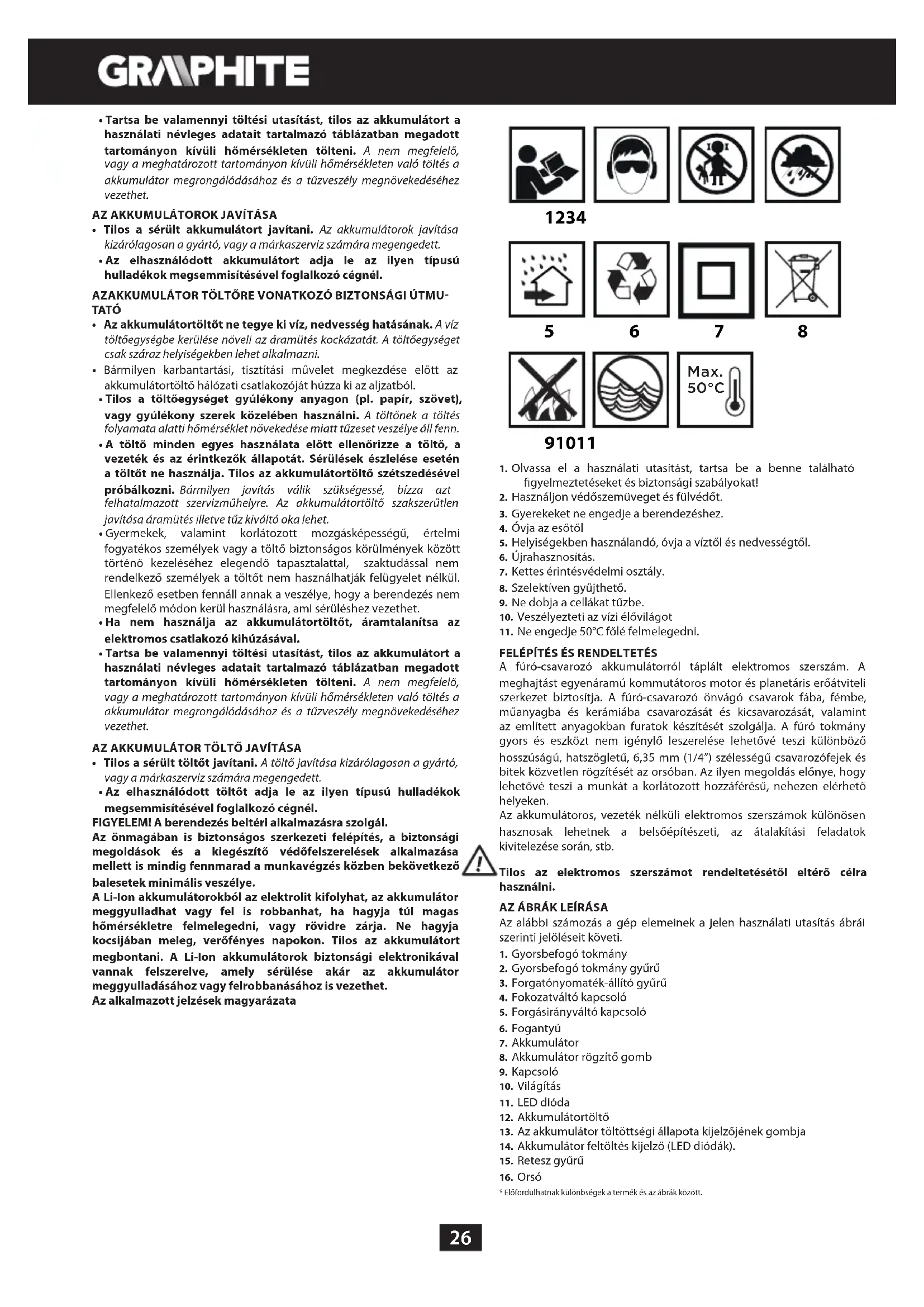 Az alábbi számozás a gép elemeinek a jelen használati utasítás ábrái szerinti jelöléseit követi. 1. Gyorsbefogó tokmány2. Gyorsbefogó tokmány gyűrű3. Forgatónyomaték-állító gyűrű4. Fokozatváltó kapcsoló5. Forgásirányváltó kapcsoló6. Fogantyú7. Akkumulátor8. Akkumulátor rögzítő gomb9. Kapcsoló10. Világítás11. LED dióda12. Akkumulátortöltő13. Az akkumulátor töltöttségi állapota kijelzőjének gombja14. Akkumulátor feltöltés kijelző (LED diódák).15. Retesz gyűrű16. Orsó* Előfordulhatnak különbségek a termék és az ábrák között.27