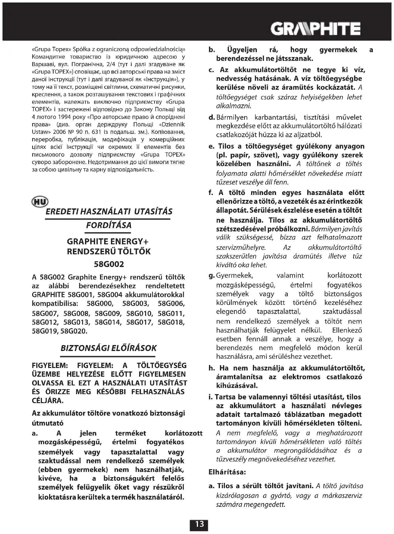 58G002 - Akkumulátor töltő Graphite - Ingyenes használati útmutató