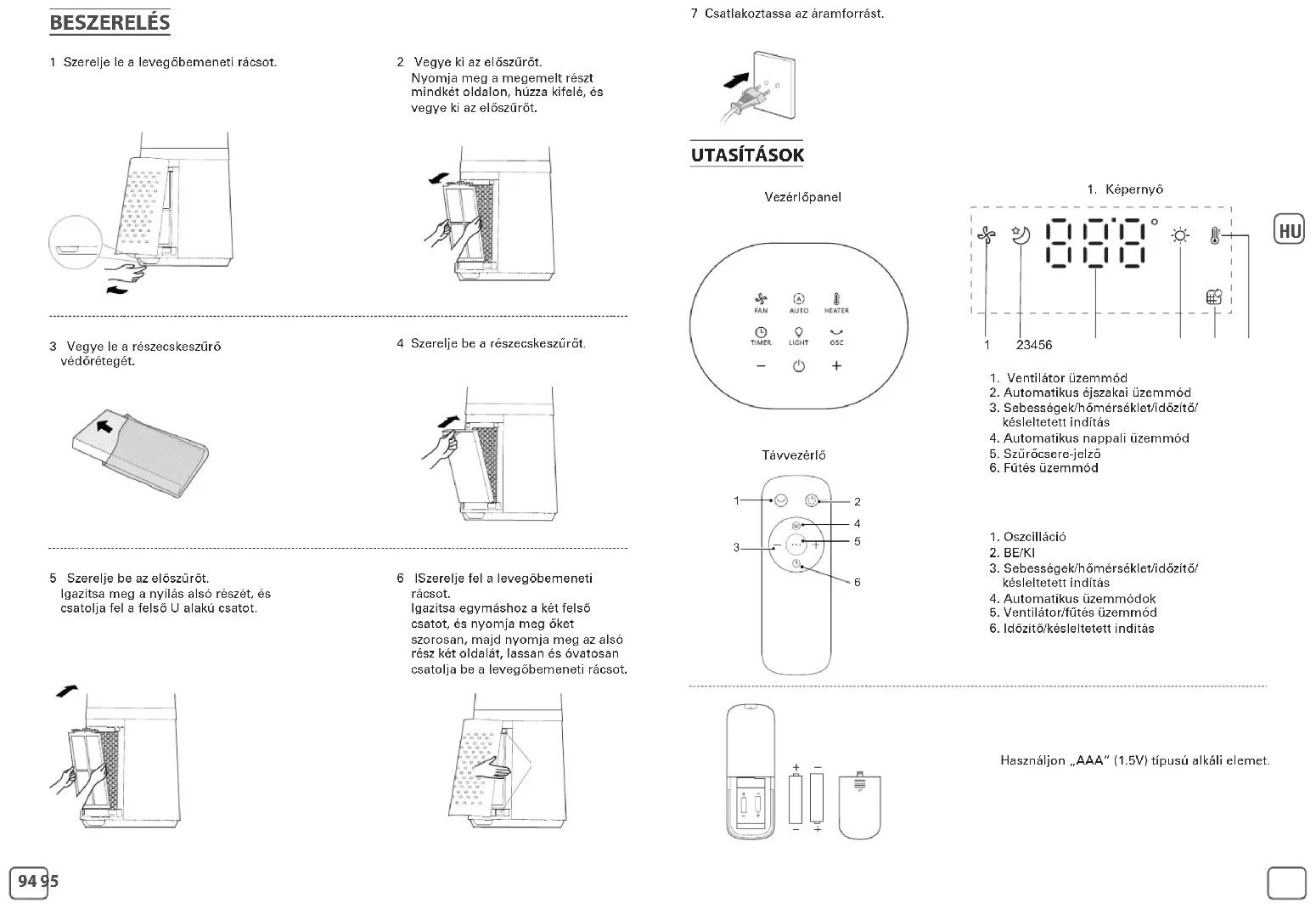 BESZERELÉS 1 Szerelje le a levegőbemeneti rácsot. 3 Vegye le a részecskeszűrő védőrétegét. 5 Szerelje be az előszűrőt. Igazítsa meg a nyílás alsó részét, és csatolja fel a felső U alakú csatot. 6 ISzerelje fel a levegőbemeneti rácsot. Igazítsa egymáshoz a két felső csatot, és nyomja meg őket szorosan, majd nyomja meg az alsó rész két oldalát, lassan és óvatosan csatolja be a levegőbemeneti rácsot. 4 Szerelje be a részecskeszűrőt. 2 Vegye ki az előszűrőt. Nyomja meg a megemelt részt mindkét oldalon, húzza kifelé, és vegye ki az előszűrőt. 7 Csatlakoztassa az áramforrást.