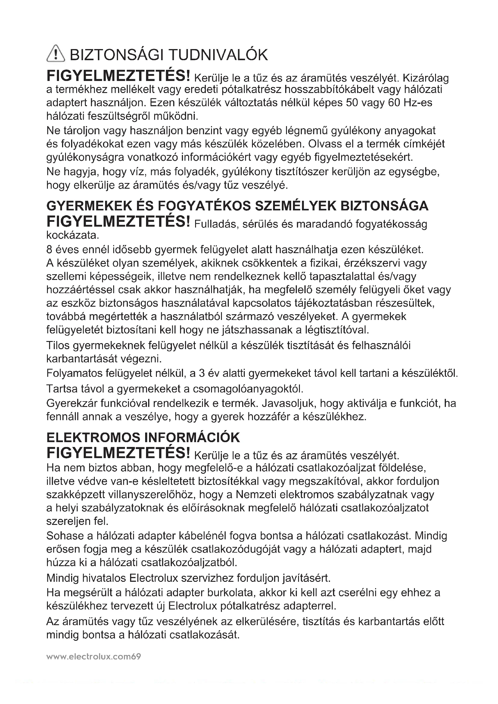 FIGYELMEZTETÉS! Kerülje le a tűz és az áramütés veszélyét. Ha nem biztos abban, hogy megfelelő-e a hálózati csatlakozóaljzat földelése, illetve védve van-e késleltetett biztosítékkal vagy megszakítóval, akkor forduljon szakképzett villanyszerelőhöz, hogy a Nemzeti elektromos szabályzatnak vagy a helyi szabályzatoknak és előírásoknak megfelelő hálózati csatlakozóaljzatot szereljen fel. Sohase a hálózati adapter kábelénél fogva bontsa a hálózati csatlakozást. Mindig erősen fogja meg a készülék csatlakozódugóját vagy a hálózati adaptert, majd húzza ki a hálózati csatlakozóaljzatból. Mindig hivatalos Electrolux szervizhez forduljon javításért. Ha megsérült a hálózati adapter burkolata, akkor ki kell azt cserélni egy ehhez a készülékhez tervezett új Electrolux pótalkatrész adapterrel. Az áramütés vagy tűz veszélyének az elkerülésére, tisztítás és karbantartás előtt mindig bontsa a hálózati csatlakozását.www.electrolux.com70