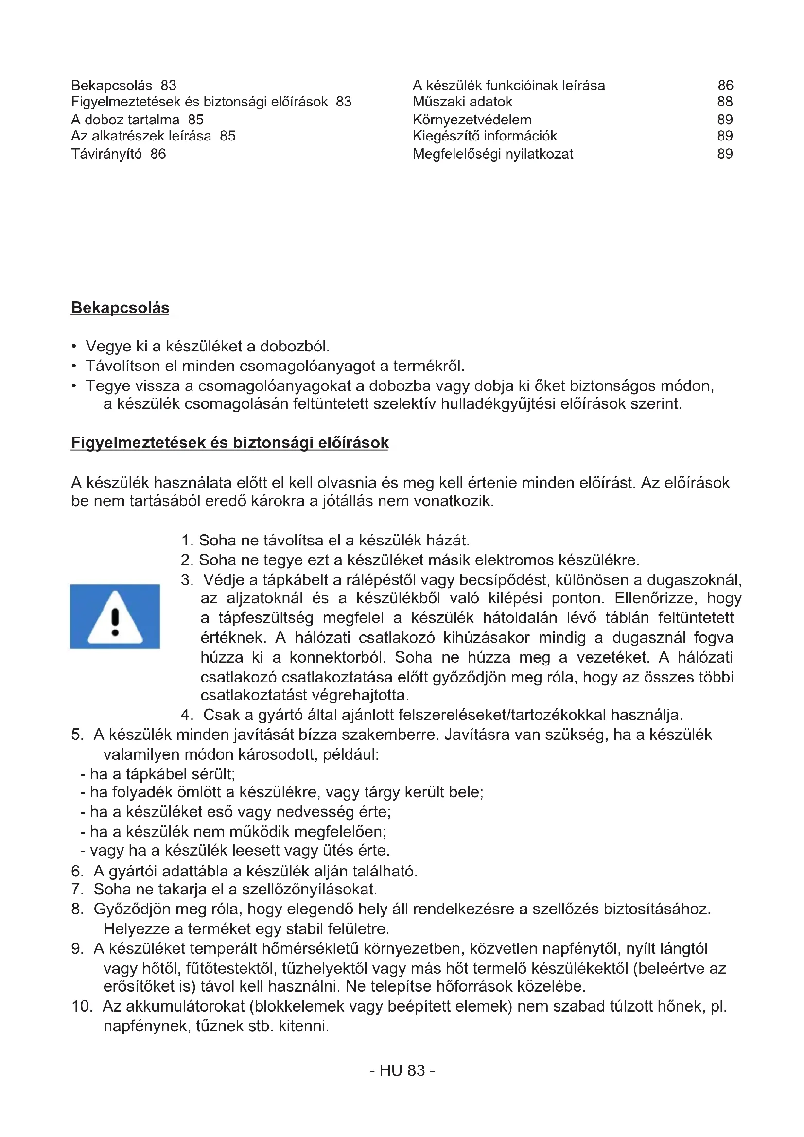 napfénynek, tűznek b. kitenni. Bekapcsolás 83 Figyelmeztetések és biztonsági előírások 83 A doboz tartalma 85 Az alkatrészek leírása 85 Távirányító 86 A készülék funkcióinak leírása 86 Műszaki adatok 88 Környezetvédelem 89 Kiegészítő információk 89 Megfelelőségi nyilatkozat 89- HU 84 -