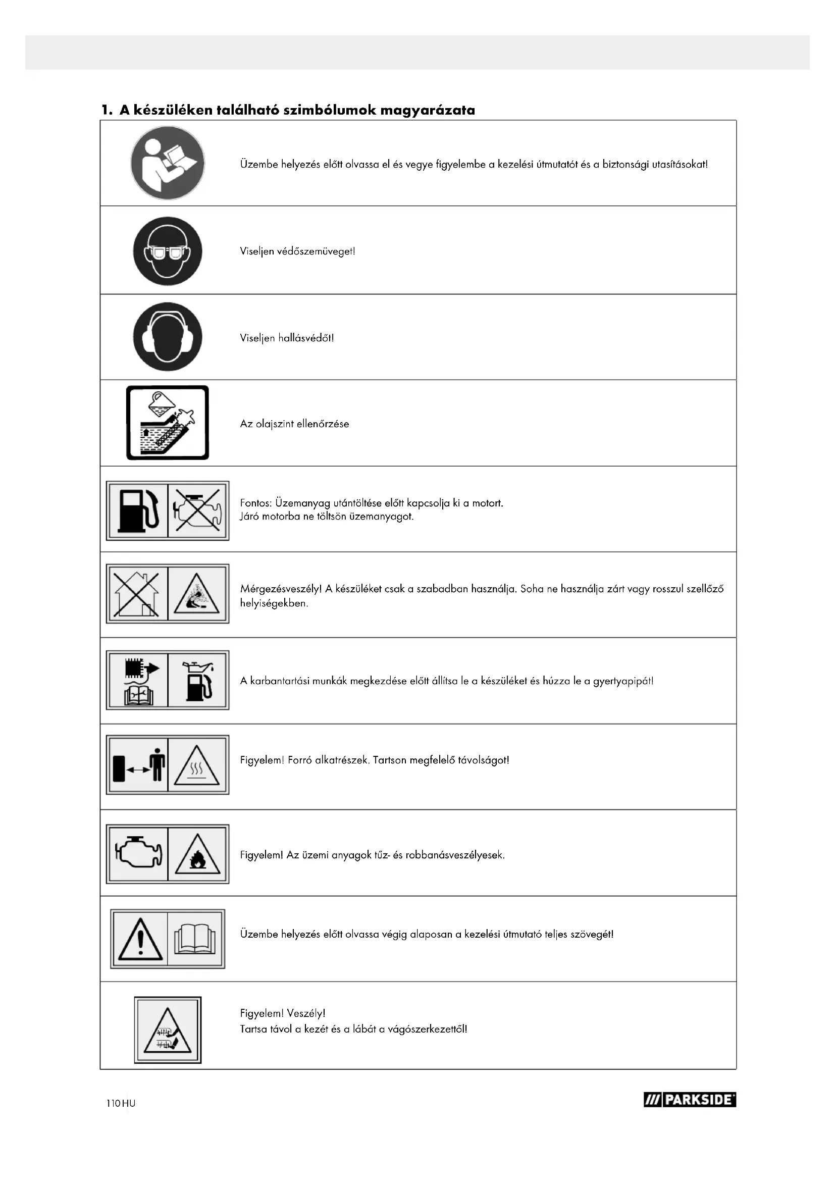 Üzembe helyezés előtt olvassa el és vegye figyelembe a kezelési útmutatót és a biztonsági utasításokat! Viseljen védőszemüveget! Viseljen hallásvédőt! Az olajszint ellenőrzése Fontos: Üzemanyag utántöltése előtt kapcsolja ki a motort. Járó motorba ne töltsön üzemanyagot. Mérgezésveszély! A készüléket csak a szabadban használja. Soha ne használja zárt vagy rosszul szellőző helyiségekben. A karbantartási munkák megkezdése előtt állítsa le a készüléket és húzza le a gyertyapipát! Figyelem! Forró alkatrészek. Tartson megfelelő távolságot! Figyelem! Az üzemi anyagok tűz- és robbanásveszélyesek. Üzembe helyezés előtt olvassa végig alaposan a kezelési útmutató teljes szövegét! Figyelem! Veszély! Tartsa távol a kezét és a lábát a vágószerkezettől!111HU Figyelem! Sérülésveszély a szétrepülő tárgyak miatt! A készülék garantált hangteljesítményszintje A termék megfelel a hatályos európai irányelveknek. STOP MOTOR Ha elengedi a biztonsági kapcsolókengyelt, a készülék leáll. A jelen kezelési útmutatóban az Ön biztonságával kapcsolatos pontokat ez a szimbólum jelöli. Gyűjtőtartály térfogata Tömeg kg-ban Munkaszélesség Tartály térfogata Motorolaj VESZÉLY! Ez a jelzőszó olyan közvetlenül fenyegető veszélyes helyzetre utal, amely súlyos sérülést vagy halálos balesetet okoz, ha nem kerülik el.112 HU FIGYELMEZTETÉS! Ez a jelzőszó olyan lehetséges veszélyhelyzetre utal, amely súlyos sérülést vagy halálos balesetet okoz- hat, ha nem kerülik el. VIGYÁZAT! Ez a jelzőszó olyan lehetséges veszélyhelyzetre utal, amely csekélyebb vagy könnyebb sérülést okozhat, ha nem kerülik el. MEGJEGYZÉS Ez a jelzőszó olyan lehetséges veszélyhelyzetre utal, amely anyagi járt okozhat a termékben vagy más vagyontárgyakban/tulajdonban, ha nem kerülik el.113HU