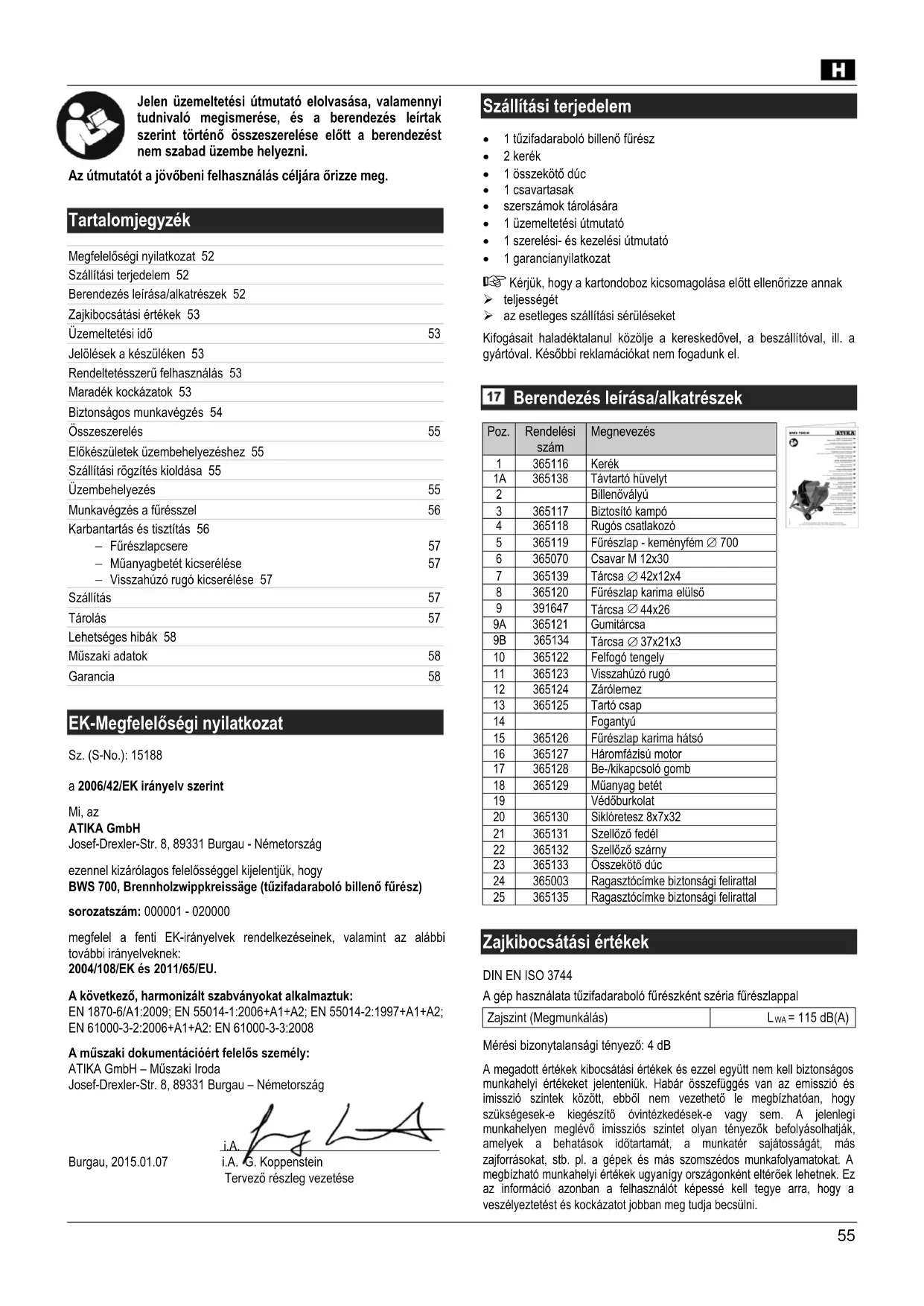 EK-Megfelelőségi nyilatkozat Sz. (S-No.): 15188 a 2006/42/EK irányelv szerint Mi, az ATIKA GmbH Josef-Drexler-Str. 8, 89331 Burgau - Németország ezennel kizárólagos felelősséggel kijelentjük, hogy BWS 700, Brennholzwippkreissäge (tűzifadaraboló billenő fűrész) sorozatszám: 000001 - 020000 megfelel a fenti EK-irányelvek rendelkezéseinek, valamint az alábbi további irányelveknek: 2004/108/EK és 2011/65/EU. A következő, harmonizált szabványokat alkalmaztuk: EN 1870-6/A1:2009; EN 55014-1:2006+A1+A2; EN 55014-2:1997+A1+A2; EN 61000-3-2:2006+A1+A2: EN 61000-3-3:2008 A műszaki dokumentációért felelős személy: ATIKA GmbH – Műszaki Iroda Josef-Drexler-Str. 8, 89331 Burgau – Németország