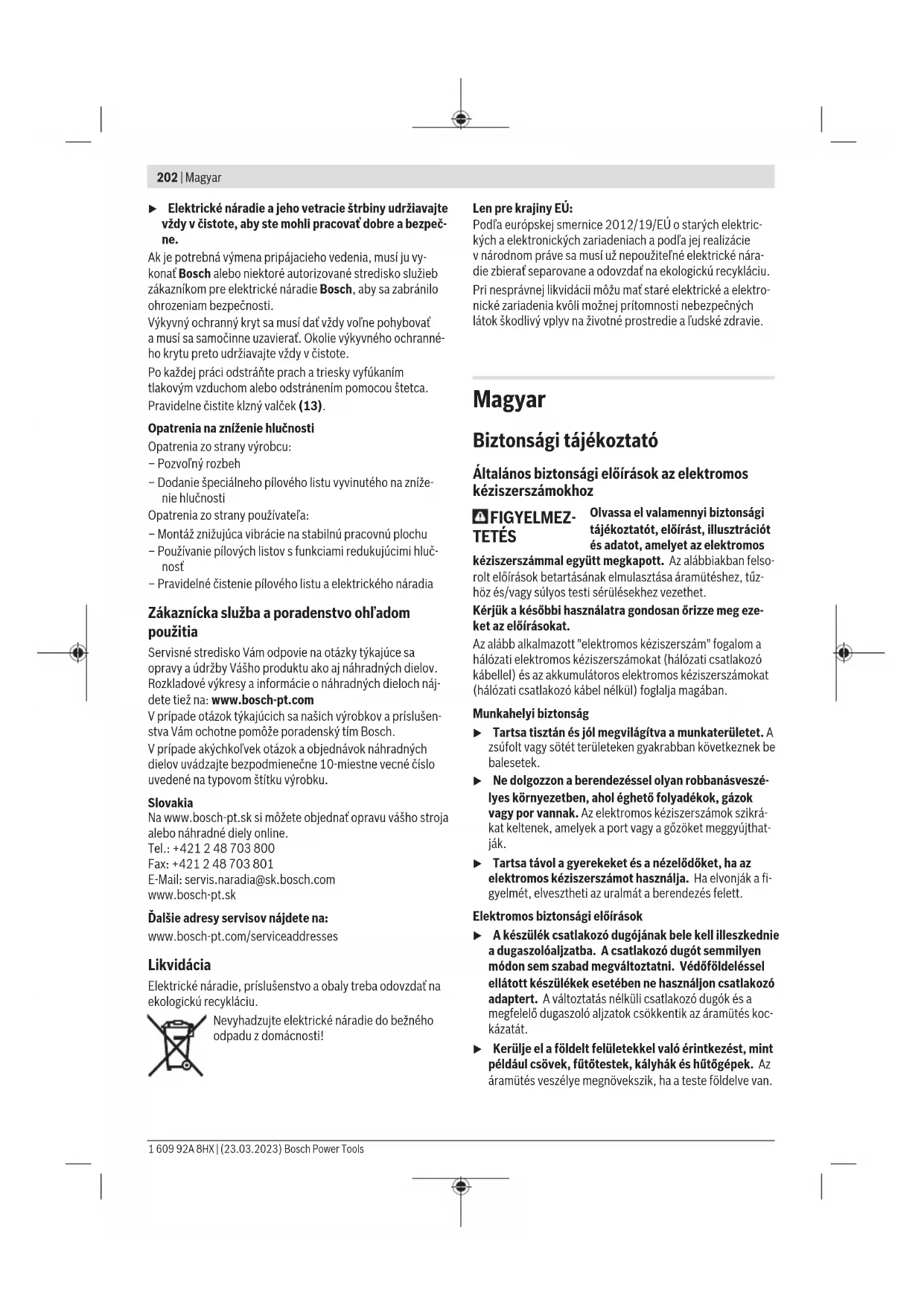 Soft Start (Lágyindítás) ● ● Lézertípus nm 650 650 mW <1 <1 Lézerosztály 2 2 Súly az „EPTA-Procedure01:2014” (2014/01EPTA-eljárás) szerint kg 19,8 19,8 A kéziszerszámhoz használható fűrészlapok méretei Fűrészlap átmérő mm 254 254 Fűrészlap magvastagság mm 1,4−2,5 1,4−2,5 Furatátmérő mm 30 25,4 Az adatok [U]=220V névleges feszültségre vonatkoznak. Ettől eltérő feszültségek és külön egyes országok számára készült kivitelek esetén ezek az adatok változhatnak. Megengedett munkadarab méretek (maximális/minimális): (lásd „Megengedett munkadarab méretek”, Oldal212) Zaj adatok A zajkibocsátási értékek a ENIEC62841-3-9szabvány elő- írásainak megfelelően kerültek meghatározásra. Az elektromos kéziszerszám A-értékelésű zajszintjének tipi- kus értékei: hangnyomásszint 88dB(A); hangteljesítmény- szint 101dB(A). A szórás, K=3dB. Viseljen fülvédőt! Az ezen előírásokban megadott zajkibocsátási érték egy szabványban rögzített mérési módszerrel került meghatáro- zásra és az elektromos kéziszerszámok összehasonlítására ez az érték felhasználható. Ez az érték a zajkibocsátás ideig- lenes becslésére is alkalmas. A megadott zajkibocsátási érték az elektromos kéziszerszám fő alkalmazási területeire vonatkozik. Ha azonban az elektro- mos kéziszerszámot más célokra, eltérő betétszerszámok- kal, vagy nem kielégítő karbantartás mellett használják, a zaj- kibocsátási érték a fenti értékektől eltérhet. Ez az egész munkaidőre vonatkozó zajkibocsátást lényegesen megnövel- heti. A zajkibocsátás pontos megbecsüléséhez figyelembe kell venni azokat az időszakokat is, amikor a készülék kikapcsolt állapotban van, vagy amikor be van ugyan kapcsolva, de nem kerül ténylegesen használatra. Ez az egész munkaidőre vo- natkozó zajkibocsátást lényegesen csökkentheti. Összeszerelés u Kerülje el az elektromos kéziszerszám akaratlan elin- dítását. A hálózati csatlakozó dugót a szerelés és az elektromos kéziszerszámon végzett bármely munka során nem szabad csatlakoztatni a hálózathoz. Szállítmány tartalma Vegye figyelembe a szállítmány terjedelmének bemutatását a Kezelési Útmutató elején. Az elektromos kéziszerszám első üzembevétele előtt ellen- őrizze, hogy a készülékkel együtt az alábbiakban felsorolt va- lamennyi alkatrész is kiszállításra került‑e: – Sínes gérvágó felszerelt fűrészlappal – Rögzítőkerék (45) – Beállítható ütközősín (28) – Csavaros szorító (41) Bosch Power Tools 1 609 92A 8HX | (23.03.2023)208 | Magyar – Belső hatlapos kulcs / laposfejű csavarhúzó (43) – Porzsák (37) – Munkadarabtámaszok (26) (2darab) Megjegyzés: Ellenőrizze az elektromos kéziszerszám esetle- ges rongálódásait. Az elektromos kéziszerszám további használata előtt gondo- san győződjön meg arról, hogy a védőberendezések vagy a némileg megsérült alkatrészek a sérülés ellenére tökéletesen és céljuknak megfelelően működnek‑e. Ellenőrizze, hogy a mozgó részek kifogástalanul működnek‑e, nem szorulnak‑e be, nem sérültek‑e meg. Az elektromos kéziszerszám csak akkor működik tökéletesen, ha annak minden egyes alkatré- sze megfelel a rá vonatkozó előírásoknak és helyesen került felszerelésre. A megrongálódott védőberendezéseket és alkatrészeket egy erre feljogosított, elismert szakműhelyben meg kell javíttatni vagy ki kell cseréltetni. Az alkatrészek felszerelése – Óvatosan vegye ki a fűrésszel szállított valamennyi alkat- részt a csomagból. – Távolítson el minden csomagolóanyagot az elektromos kéziszerszámról és a készülékkel szállított tartozékokról. – A berendezéssel szállított berendezésrészek felszerelése- kor a munka megkönnyítésére vegye tekintetbe, hogy az elektromos kéziszerszám szállítási helyzetben van. A munkadarabtámaszok felszerelése (lásd azA1ábrát) A munkadarabtámaszok (26) bal és jobb oldalt vagy az elekt- romos kéziszerszám elején is elhelyezhetőek. A rugalmas csatlakoztathatóság számos hosszabb és szélesebb változa- tot tesz lehetővé (lásd azG ábrát. – Igény szerint dugja a munkadarabtámaszt (26) a befogók- ba (47) az elektromos kéziszerszámon vagy a második munkadarabtámasz befogóiba (48). u Soha ne vigye az elektromos kéziszerszámot a munka- darabtámaszoknál fogva! Az elektromos kéziszerszám szállításához mindig csak a szállításra szolgáló alkatrészeket használja! A rögzítőkerék felszerelése (lásd azA2ábrát) A rögzítőkerék (45) a beállított függőleges gérszöget rögzíti és a biztonságos üzemeltetéshez szükséges. – Csavarja le a hatlapú anyát a menetes csapszegről (49). – Csavarja fel a rögzítőkereket (45) az óramutató járásával megegyező irányba a menetes csapszegre (49), és húzza meg. A beállítható ütközősín felszerelése (lásd azA3 ábrát) A beállítható ütközősínt (28) a fűrészelés előtt kell felszerel- ni. – Tolja az ütközősínt (28) jobbra a fűrészlaptól a megfelelő horonyba, és húzza meg a reteszelőcsavart (44). Az ütközősín lapos részének befelé, a fűrészlaphoz kell mutatnia. Stacioner vagy flexibilis felszerelés u A biztonságos kezelés biztosítására az elektromos ké- ziszerszámot a használat előtt fel kell szerelni egy sta- bil, sík munkafelületre (például egy munkapadra). Felszerelés egy munkafelületre (lásd a B1−B2ábrát) – Megfelelő csavarkötésekkel rögzítse az elektromos kézi- szerszámot a munkafelületre. Erre vannak előirányozva a (15)furatok. vagy – Csavarozza hozzá az elektromos kéziszerszám lábait a ke- reskedelemben szokványosan kapható csavaros szorítók- kal a munkafelülethez. Felszerelés egy Bosch gyártmányú munkaasztalra A Bosch gyártmányú GTA-munkaasz