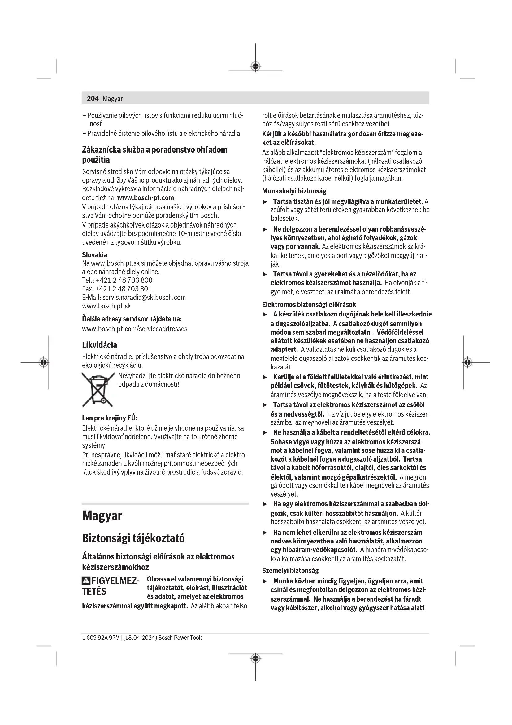 kg 16,8 16,8 Érintésvédelmi osztály /II /II A kéziszerszámhoz használható fűrészlapok méretei Fűrészlap-átmérő D mm 216 216 Fűrészlap-magvastagság mm 1,2−1,8 1,2−1,8 Furatátmérő d mm 30 25,4 A) Súly hálózati csatlakozókábel és hálózati csatlakozódugó nélkül Az adatok [U]=220V névleges feszültségre vonatkoznak. Ettől eltérő feszültségek és külön egyes országok számára készült kivitelek esetén ezek az adatok változhatnak. Megengedett munkadarab méretek (maximális/minimális): (lásd „Megengedett munkadarab méretek”, Oldal214) Az értékek termékenként változhatnak és függnek az alkalmazási, valamint környezeti feltételektől is. További információk a www.bosch-professional.com/wac címen találhatók. Zaj adatok A zajkibocsátási értékek a ENIEC62841-3-9szabvány elő- írásainak megfelelően kerültek meghatározásra. Az elektromos kéziszerszám A-értékelésű zajszintjének tipi- kus értékei: hangnyomásszint 95dB(A); hangteljesítmény- szint 109dB(A). A szórás, K=3dB. Viseljen fülvédőt! Az ezen előírásokban megadott zajkibocsátási érték egy szabványban rögzített mérési módszerrel került meghatáro- zásra és az elektromos kéziszerszámok összehasonlítására ez az érték felhasználható. Ez az érték a zajkibocsátás ideig- lenes becslésére is alkalmas. A megadott zajkibocsátási érték az elektromos kéziszerszám fő alkalmazási területeire vonatkozik. Ha azonban az elektro- mos kéziszerszámot más célokra, eltérő betétszerszámok- kal, vagy nem kielégítő karbantartás mellett használják, a zaj- kibocsátási érték a fenti értékektől eltérhet. Ez az egész munkaidőre vonatkozó zajkibocsátást lényegesen megnövel- heti. A zajkibocsátás pontos megbecsüléséhez figyelembe kell venni azokat az időszakokat is, amikor a készülék kikapcsolt állapotban van, vagy amikor be van ugyan kapcsolva, de nem kerül ténylegesen használatra. Ez az egész munkaidőre vo- natkozó zajkibocsátást lényegesen csökkentheti. Összeszerelés u Kerülje el az elektromos kéziszerszám akaratlan elin- dítását. A hálózati csatlakozó dugót a szerelés és az elektromos kéziszerszámon végzett bármely munka során nem szabad csatlakoztatni a hálózathoz. Szállítmány tartalma Vegye figyelembe a szállítmány terjedelmének bemutatását a Kezelési Útmutató elején. Az elektromos kéziszerszám első üzembevétele előtt ellen- őrizze, hogy a készülékkel együtt az alábbiakban felsorolt va- lamennyi alkatrész is kiszállításra került‑e: – Sínes gérvágó felszerelt fűrészlappal – Rögzítőkerék (45) – Beállítható ütközősín (28) – Csavaros szorító (41) – Belső hatlapos kulcs / laposfejű csavarhúzó (43) – Porzsák (37) – Munkadarabtámaszok (26) (2darab) Megjegyzés: Ellenőrizze az elektromos kéziszerszám esetle- ges rongálódásait. Az elektromos kéziszerszám további használata előtt gondo- san győződjön meg arról, hogy a védőberendezések vagy a némileg megsérült alkatrészek a sérülés ellenére tökéletesen és céljuknak megfelelően működnek‑e. Ellenőrizze, hogy a mozgó részek kifogástalanul működnek‑e, nem szorulnak‑e be, nem sérültek‑e meg. Az elektromos kéziszerszám csak akkor működik tökéletesen, ha annak minden egyes alkatré- sze megfelel a rá vonatkozó előírásoknak és helyesen került felszerelésre. A megrongálódott védőberendezéseket és alkatrészeket egy erre feljogosított, elismert szakműhelyben meg kell javíttatni vagy ki kell cseréltetni. Bosch Power Tools 1 609 92A 9PM | (18.04.2024)210 | Magyar Az alkatrészek felszerelése – Óvatosan vegye ki a fűrésszel szállított valamennyi alkat- részt a csomagból. – Távolítson el minden csomagolóanyagot az elektromos kéziszerszámról és a készülékkel szállított tartozékokról. – A berendezéssel szállított berendezésrészek felszerelése- kor a munka megkönnyítésére vegye tekintetbe, hogy az elektromos kéziszerszám szállítási helyzetben van. A munkadarabtámaszok felszerelése (lásd azA1ábrát) A munkadarabtámaszok (26) bal és jobb oldalt vagy az elekt- romos kéziszerszám elején is elhelyezhetőek. A rugalmas csatlakoztathatóság számos hosszabb és szélesebb változa- tot tesz lehetővé (lásd azG ábrát. – Igény szerint dugja a munkadarabtámaszt (26) a befogók- ba (47) az elektromos kéziszerszámon vagy a második munkadarabtámasz befogóiba (48). u Soha ne vigye az elektromos kéziszerszámot a munka- darabtámaszoknál fogva! Az elektromos kéziszerszám szállításához mindig csak a szállításra szolgáló alkatrészeket használja! A rögzítőkerék felszerelése (lásd azA2ábrát) A rögzítőkerék (45) a beállított függőleges gérszöget rögzíti és a biztonságos üzemeltetéshez szükséges. – Csavarja le a hatlapú anyát a menetes csapszegről (49). – Csavarja fel a rögzítőkereket (45) az óramutató járásával megegyező irányba a menetes csapszegre (49), és húzza meg. A beállítható ütközősín felszerelése (lásd azA3 ábrát) A beállítható ütközősínt (28) a fűrészelés előtt kell felszerel- ni. – Tolja az ütközősínt (28) jobbra a fűrészlaptól a megfelelő horonyba, és húzza meg a reteszelőcsavart (44). Az ütközősín lapos részének befelé, a fűrészlaphoz kell mutatnia. Stacioner vagy flexibilis felszerelés u A biztonságos kezelés biztosítására az elektromos ké- ziszerszámot a használat előtt fel kell szerelni egy sta- bil, sík munkafelületre (például egy munkapadra). Felszerelés egy munkafelületre (lásd a B1−B2ábrát) – Megfelelő csavarkötésekkel rögzítse az elektromos kézi- szerszámot a munkafelületre. Erre vannak előirányozva a (15)furatok. vagy – Csavarozza hozzá az elektromos kéziszerszám lábait a ke- reskedelemben sz