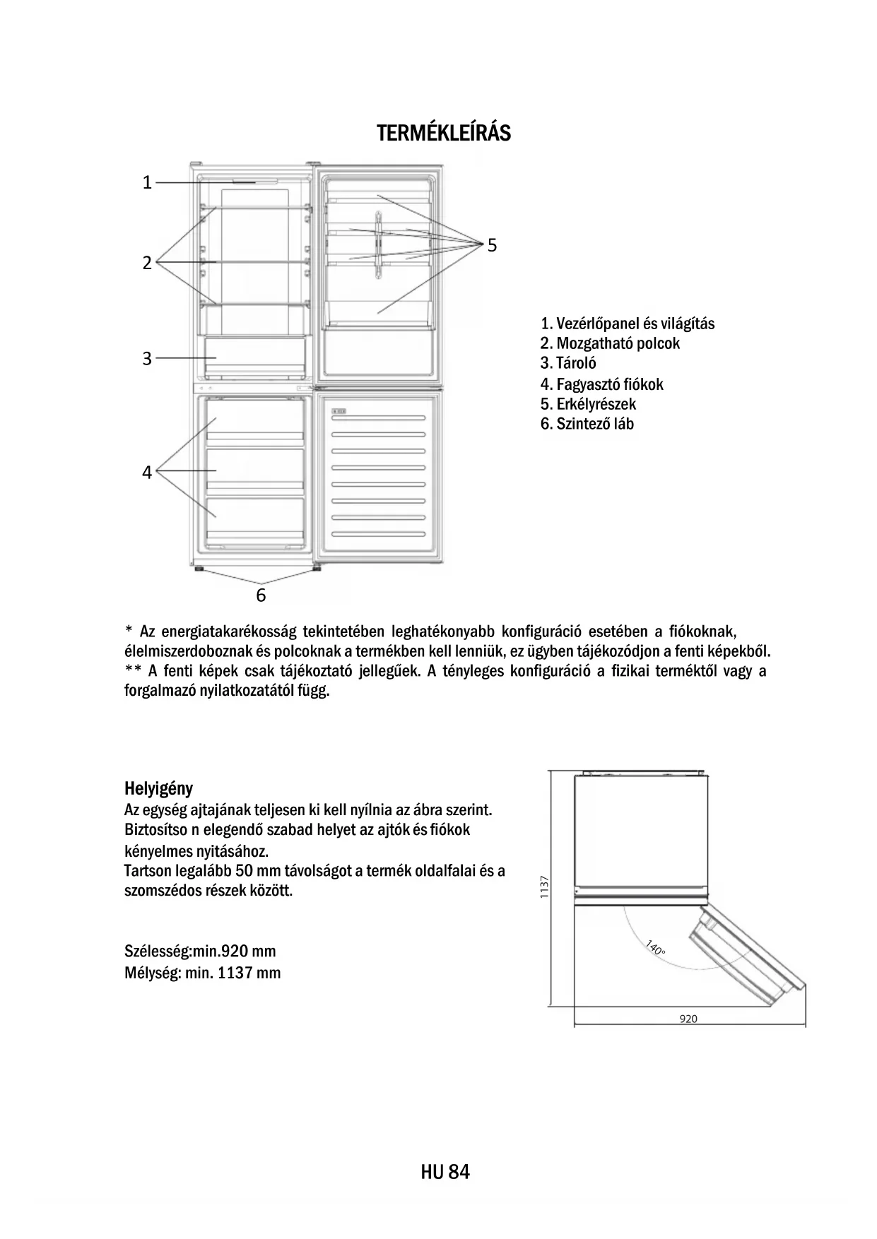 - Az energiatakarékosság tekintetében leghatékonyabb konfiguráció esetében a fiókoknak, élelmiszerdoboznak és polcoknak a termékben kell lenniük, ez ügyben tájékozódjon a fenti képekből. ** A fenti képek csak tájékoztató jellegűek. A tényleges konfiguráció a fizikai terméktől vagy a forgalmazó nyilatkozatától függ. Helyigény Az egység ajtajának teljesen ki kell nyílnia az ábra szerint. Biztosítso n elegendő szabad helyet az ajtók és fiókok kényelmes nyitásához. Tartson legalább 50 mm távolságot a termék oldalfalai és a szomszédos részek között. Szélesség:min.920 mm Mélység: min. 1137 mm
