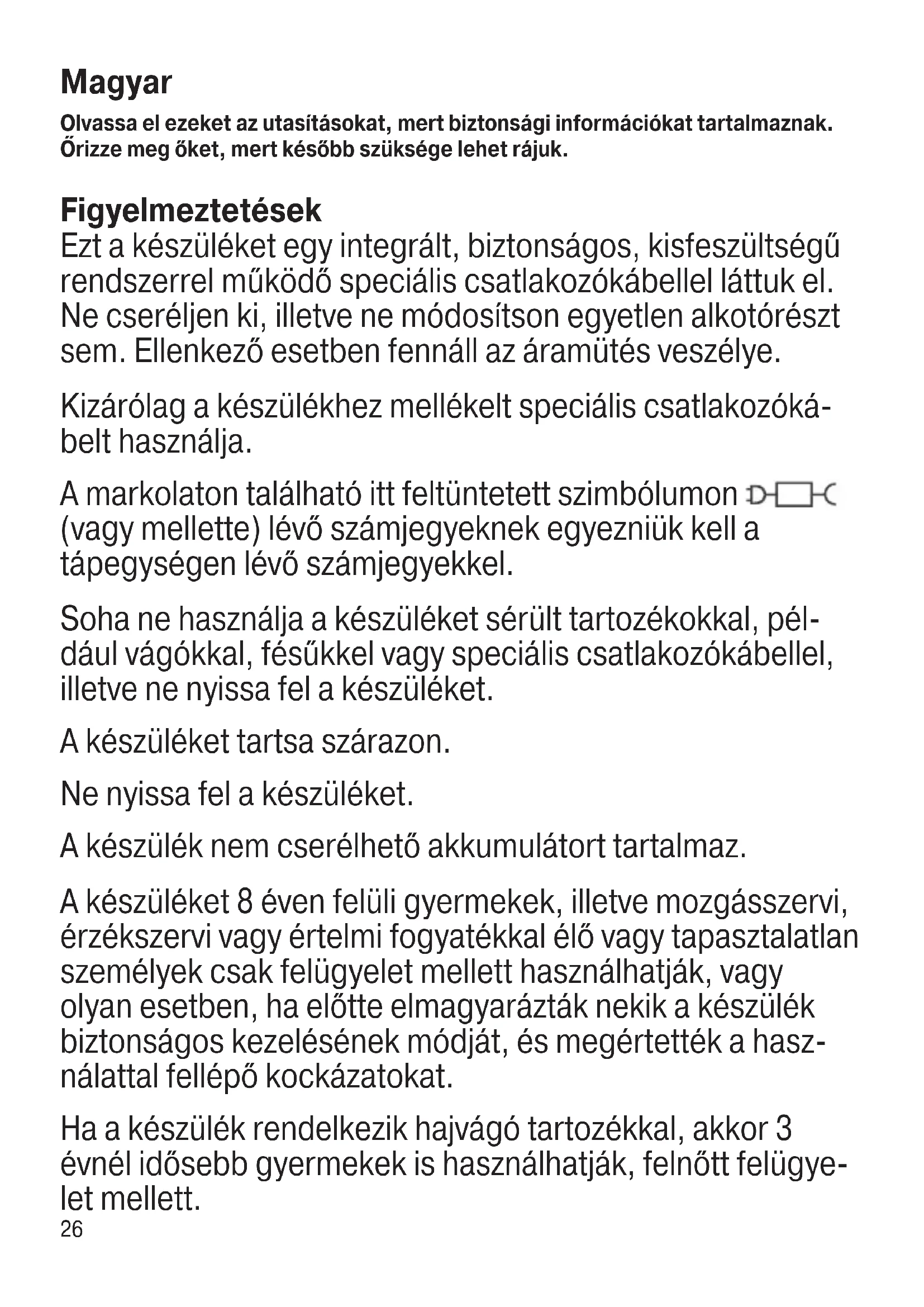 - nie pri všetkých modeloch ** vzhľad sa môže líšiť Elektrické špecifikácie nájdete na štítku špeciálneho napájacieho kábla. Upozornenie týkajúce sa životného prostredia Tento prístroj obsahuje batérie a/alebo recyklovateľný elektronický odpad. V záujme ochrany životného prostredia prístroj nelikvidujte s domovým odpadom, ale ho odovzdajte na zbernom mieste pre elektronický odpad. Informácie sa môžu zmeniť bez upozornenia. Deklarovaná hodnota emisie hluku tohto spotrebiča je 63 dB(A), čo predstavuje hladinu A akustického výkonu vzhľadom na referenčný akustický výkon 1 pW. 90340910_Type5516_BT3421_3420_3411_3410_3400x_CEEMEA.indd 2490340910_Type5516_BT3421_3420_3411_3410_3400x_CEEMEA.indd 24 20.07.22 10:0320.07.22 10:0325 Záruka Poskytujeme dvojročnú záruku na výrobok s platnosťou od dátumu jeho zakúpenia. V záručnej lehote bezplatne odstránime všetky poruchy prístroja zapríčinené chybou materiálu alebo výroby, a to buď formou opravy, alebo výmenou celého prístroja (podľa nášho vlastného uváženia). V závislosti od dostupnosti náhradnej jednotky môže ísť o odlišnú farbu alebo ekvivalentný model. Uvedená záruka je platná v každom štáte, v kto- rom tento prístroj dodáva spoločnosť Braun alebo jej poverený distribútor. Záruka sa netýka nasledujúcich prípadov: poškodenie zapríčinené nesprávnym použitím, normálne opotrebovanie (napríklad plátkov holiaceho strojčeka alebo puzdra zastrihá- vača), ako aj poruchy, ktoré majú zanedbateľný účinok na hodnotu alebo funkciu prí- stroja. Ak opravu uskutoční neautorizovaná osoba a ak sa nepoužijú pôvodné náhradné súčiastky spoločnosti Braun, platnosť záruky bude ukončená. Ak v záručnej lehote požadujete vykonanie servisnej opravy, odovzdajte celý prístroj s potvrdením o nákupe v autorizovanom servisnom stredisku spoločnosti Braun alebo ho do strediska zašlite. 90340910_Type5516_BT3421_3420_3411_3410_3400x_CEEMEA.indd 2590340910_Type5516_BT3421_3420_3411_3410_3400x_CEEMEA.indd 25 20.07.22 10:0320.07.22 10:0326 Magyar Olvassa el ezeket az utasításokat, mert biztonsági információkat tartalmaznak. Őrizze meg őket, mert később szüksége lehet rájuk. Figyelmeztetések Ezt a készüléket egy integrált, biztonságos, kisfeszültségű rendszerrel működő speciális csatlakozókábellel láttuk el. Ne cseréljen ki, illetve ne módosítson egyetlen alkotórészt sem. Ellenkező esetben fennáll az áramütés veszélye. Kizárólag a készülékhez mellékelt speciális csatlakozóká- belt használja. A markolaton található itt feltüntetett szimbólumon (vagy mellette) lévő számjegyeknek egyezniük kell a tápegységen lévő számjegyekkel. Soha ne használja a készüléket sérült tartozékokkal, pél- dául vágókkal, fésűkkel vagy speciális csatlakozókábellel, illetve ne nyissa fel a készüléket. A készüléket tartsa szárazon. Ne nyissa fel a készüléket. A készülék nem cserélhető akkumulátort tartalmaz. A készüléket 8 éven felüli gyermekek, illetve mozgásszervi, érzékszervi vagy értelmi fogyatékkal élő vagy tapasztalatlan személyek csak felügyelet mellett használhatják, vagy olyan esetben, ha előtte elmagyarázták nekik a készülék biztonságos kezelésének módját, és megértették a hasz- nálattal fellépő kockázatokat. Ha a készülék rendelkezik hajvágó tartozékkal, akkor 3 évnél idősebb gyermekek is használhatják, felnőtt felügye- let mellett. 90340910_Type5516_BT3421_3420_3411_3410_3400x_CEEMEA.indd 2690340910_Type5516_BT3421_3420_3411_3410_3400x_CEEMEA.indd 26 20.07.22 10:0320.07.22 10:0327 A készülékkel gyermekek nem játszhatnak! A tisztítást és karbantartást gyermekek nem végezhetik! Csak háztartási használatra! Vigyázat! Töltéskor győződjön meg arról, hogy a készülék kikapcsolt állapotban van! Fontos! A töltés 5 és 35 °C közötti hőmérsékleten javasolt. Előfordulhat, hogy szélsőségesen ala- csony vagy magas hőmérsékleten az akkumulátor nem megfelelően vagy egyáltalán nem tölt fel. A nyírás 15 és 35 °C közötti hőmérsékleten javasolt. A készüléket ne tegye ki hosszabb ideig 50 °C-nál magasabb hőmérsékletnek. A tartozékok megfelelő működéséhez rendszeresen olajozza meg a nyírót és a szitát egy csepp (nem tartozék) híg gépolajjal. A készülék leírása 1a Nyírófej*/** 1b Precíziós nyírófej*/** 1c Mini szitás borotvafej* 2 Hosszválasztó 3 Be-/kikapcsológomb 4 Tápcsatlakozó 5 Tápegység** 6 Töltés jelzőfénye 7 Precíziós szakállfésű (0,5–10 mm)*/** 8 Precíziós hajfésű (10,5–20 mm)*/**