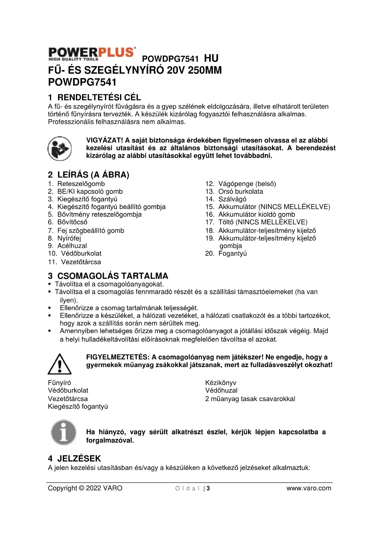 - Amennyiben lehetséges őrizze meg a csomagolóanyagot a jótállási időszak végéig. Majd a helyi hulladékeltávolítási előírásoknak megfelelően távolítsa el azokat. FIGYELMEZTETÉS: A csomagolóanyag nem játékszer! Ne engedje, hogy a gyermekek műanyag zsákokkal játszanak, mert az fulladásveszélyt okozhat! Fűnyíró Védőburkolat Vezetőtárcsa Kiegészítő fogantyú Kézikönyv Védőhuzal 2 műanyag tasak csavarokkal Ha hiányzó, vagy sérült alkatrészt észlel, kérjük lépjen kapcsolatba a forgalmazóval. 4 JELZÉSEK A jelen kezelési utasításban és/vagy a készüléken a következő jelzéseket alkalmaztuk:POWDPG7541 HU Copyright © 2022 VARO O l d a l | 4 www.varo.com