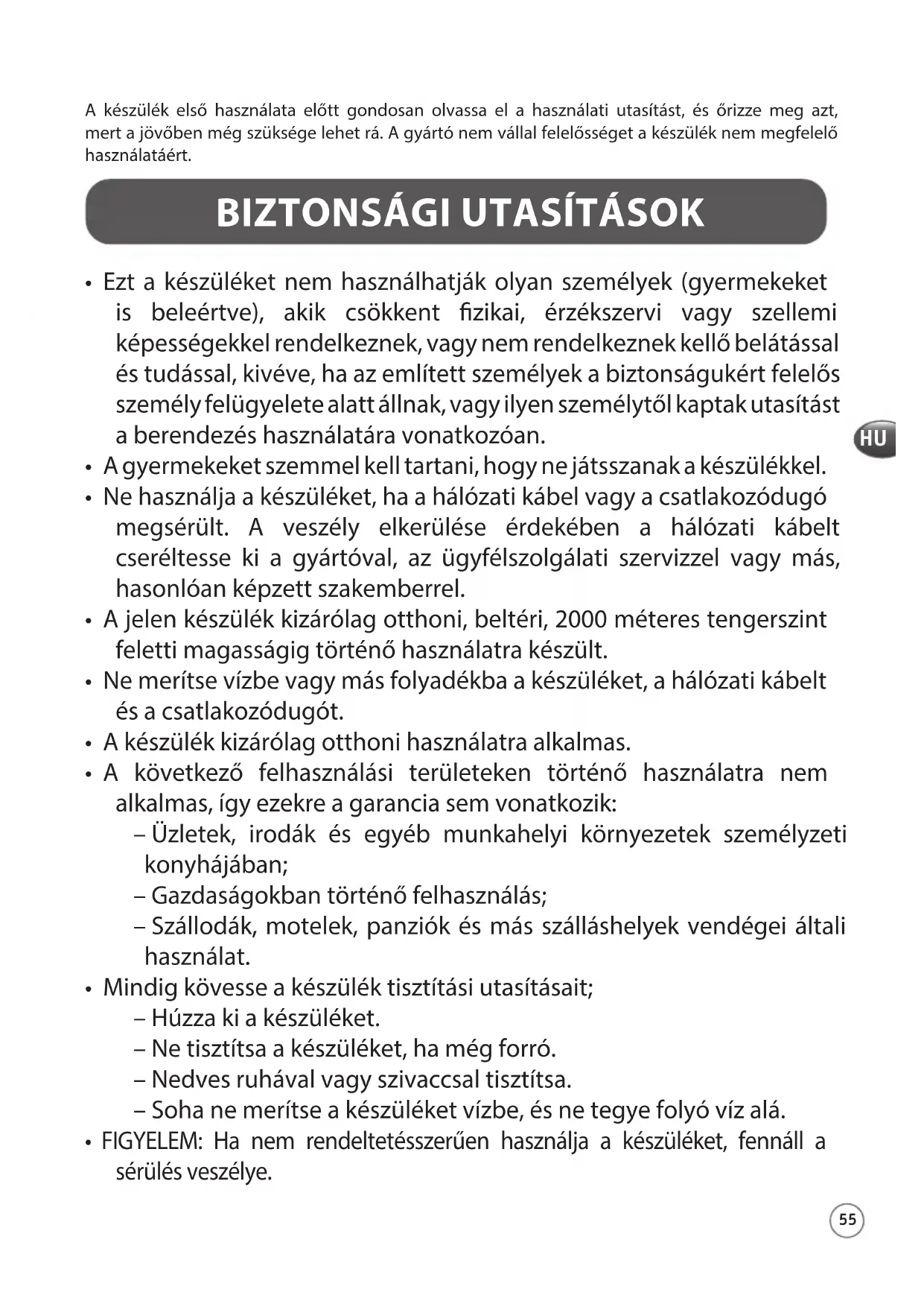 - A készüléket a nyolc évesnél idősebb gyermekek csak abban az esetben használhatják, ha felügyelet alatt állnak, illetve utasítást kaptak a készülék biztonságos használatára vonatkozóan, és tisztában vannak a használattal járó veszélyekkel. A tisztítást és a felhasználó által végzendő karbantartást gyermekek csak abban az esetben végezhetik el, ha nyolc évesnél idősebbek és biztosított a felügyeletük.