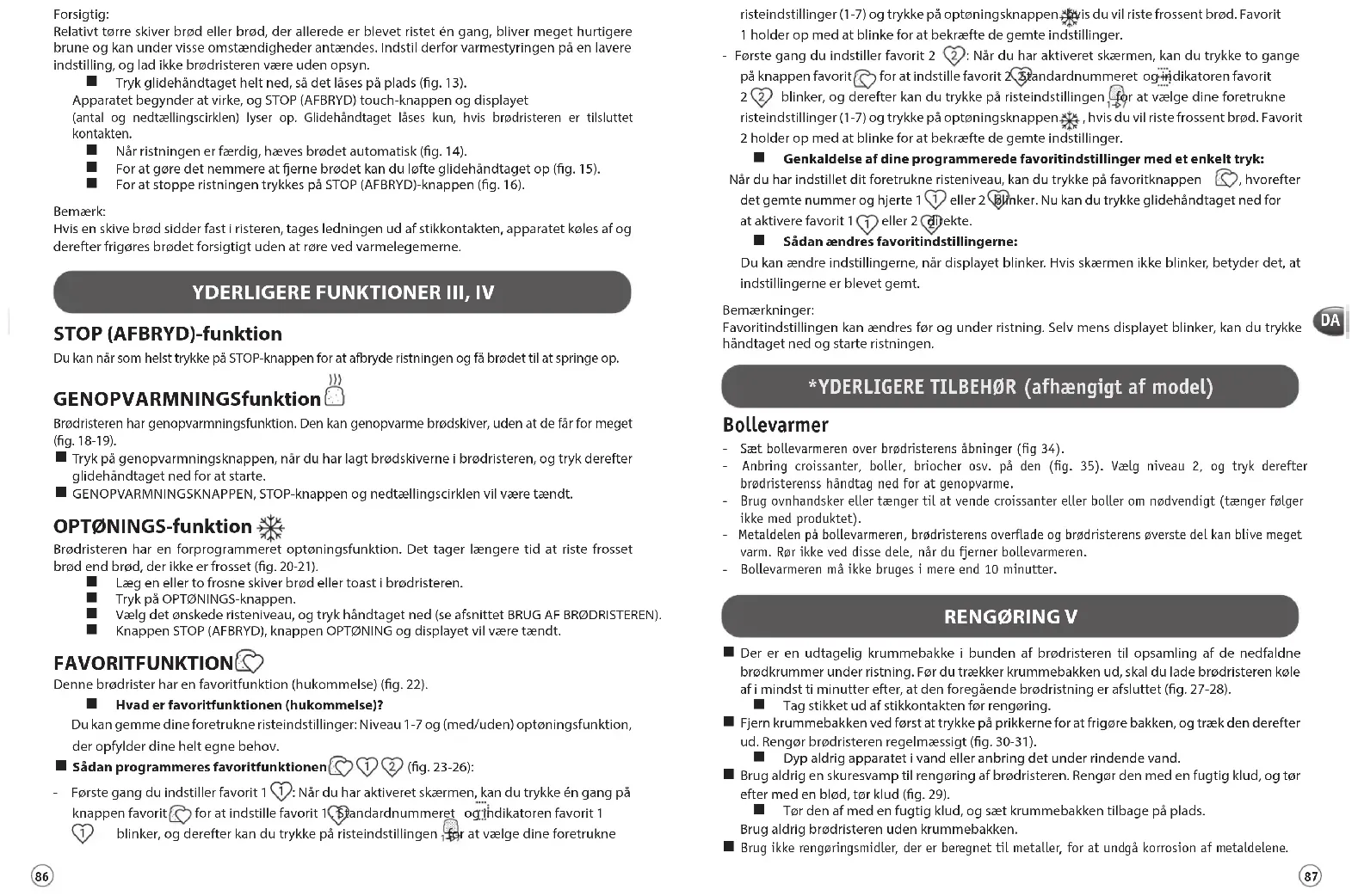 Tegyen egy vagy két szelet fagyasztott kenyeret vagy pirítóst a kenyérpirítóba. Nyomja meg a KIOLVASZTÁS gombot. Válassza ki a kívánt pirítási fokozatot, és nyomja le a kenyérkiemelő kart (lásd „A kenyérpirító használata” c. részt). A LEÁLLÍTÁS (MÉGSE) gomb, a KIOLVASZTÁS gomb és a kijelző bekapcsol. KEDVENCEK funkció A kenyérpirítón van kedvenc (memória) funkció (22. ábra). Mi a kedvenc (memória) funkció? Elmentheti kedvenc pirítási beállításait: 1-7 pirítási fokozat és kiolvasztási funkció (kiválasztásával vagy anélkül) a személyes igények kielégítésére. A FAV (kedvenc) funkció programozása (23-26. ábra):9796