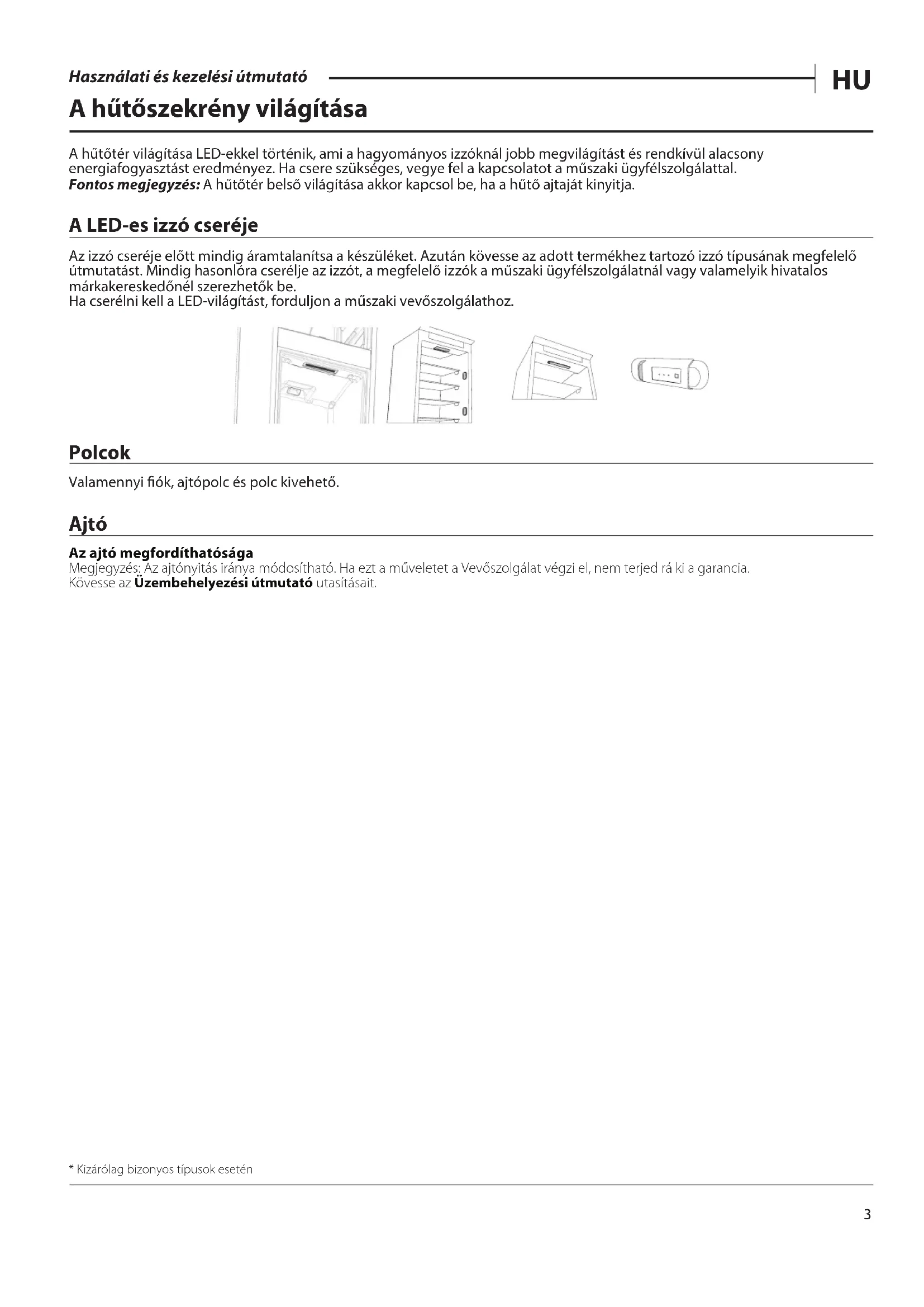 Használati és kezelési útmutató A hűtőszekrény világítása A hűtőtér világítása LED-ekkel történik, ami a hagyományos izzóknál jobb megvilágítást és rendkívül alacsony energiafogyasztást eredményez. Ha csere szükséges, vegye fel a kapcsolatot a műszaki ügyfélszolgálattal. Fontos megjegyzés: A hűtőtér belső világítása akkor kapcsol be, ha a hűtő ajtaját kinyitja. A LED-es izzó cseréje Az izzó cseréje előtt mindig áramtalanítsa a készüléket. Azután kövesse az adott termékhez tartozó izzó típusának megfelelő útmutatást. Mindig hasonlóra cserélje az izzót, a megfelelő izzók a műszaki ügyfélszolgálatnál vagy valamelyik hivatalos márkakereskedőnél szerezhetők be. Ha cserélni kell a LED-világítást, forduljon a műszaki vevőszolgálathoz. Polcok Valamennyi ók, ajtópolc és polc kivehető. Ajtó Az ajtó megfordíthatósága Megjegyzés: Az ajtónyitás iránya módosítható. Ha ezt a műveletet a Vevőszolgálat végzi el, nem terjed rá ki a garancia.Kövesse az Üzembehelyezési útmutató utasításait.* Kizárólag bizonyos típusok esetén4 Használati és kezelési útmutató A készülék használata Első használat Az üzembe helyezést követően várjon legalább két órát, mielőtt a készüléket csatlakoztatná az elektromos hálózathoz. A készülék elektromos hálózathoz csatlakoztatásakor az automatikusan működésbe lép. Az ételek ideális tárolási hőmérséklete gyárilag előre be van állítva. A készülék a bekapcsolás után 4-6 órával éri el a megfelelő tárolási hőmérsékletet szokásos mennyiségű élelmiszer tárolása esetén. Helyezze be a ventilátorba az antibakteriális szagtalanító szűrőt a csomagoláson látható utasítások szerint (ha van). Ha hangjelzés hallható, az a bekapcsolt hőmérsékleti riasztást jelzi: nyomja meg a gombot a hangjelzés elnémításához. A hűtőtér és az élelmiszerek tárolása A hűtőtér a friss ételek és italok tárolására szolgál. A hűtőtér jégtelenítése teljesen automatikusan történik. Az automatikus jégtelenítés folyamatát a hűtőtér belső részében, a hátsó falon időnként megjelenő vízcseppek jelzik. A leolvasztáskor képződő víz automatikusan egy leeresztőnyílásba folyik, és összegyűlik egy edényben, amiből azután elpárolog. Megjegyzés: A külső hőmérséklet, az ajtónyitások gyakorisága és a készülék elhelyezése befolyásolhatja a két rekesz hőmérsékletét. A hőmérsékleteket ezen tényezők figyelembevételével kell beállítani. Nagyon magas páratartalom esetén kondenzvíz képződhet a hűtőtérben, elsősorban az üvegpolcokon. Ilyen esetben célszerű lezárni a folyadékot tartalmazó tárolóedényeket (például a leveses tálat), becsomagolni a nagy folyadéktartalmú élelmiszereket (például a zöldségeket) és bekapcsolni a ventilátort, ha van. Valamennyi fiók, ajtópolc és polc kivehető. Multiflow légelosztás A multiow áramlás segíti a hideg levegő egyenletes eloszlását a rekeszben az élelmiszerek hatékonyabb tárolásához. Az ételek a készülék bármely polcára helyezhetők. Ügyeljen, hogy ne fedje le a légbefúvó nyílásokat, így biztosítható a levegő szabad áramlása. A friss élelmiszerek és italok tárolása A nagy mennyiségű etilént kibocsátó élelmiszereket (alma, sárgabarack, körte, őszibarack, avokádó, füge, szilva, áfonya, dinnye, bab) és az erre érzékeny élelmiszereket (pl. gyümölcsök, zöldségek, saláta) egymástól elkülönítve vagy becsomagolva kell tárolni eltarthatóságuk megőrzése érdekében; például ne tároljon együtt paradicsomot kivivel vagy fejes káposztával. Ne tegye túl közel egymáshoz az élelmiszereket, hogy a levegő megfelelően tudjon áramlani. Az ételek csomagolásához használjon újrahasznosítható műanyagból, fémből, alumíniumból vagy üvegből készült tárolóedényeket, illetve háztartási fóliát. Ha a hűtőtérben kis mennyiségű élelmiszert szeretne tárolni, azt javasoljuk, hogy a gyümölcsös és zöldséges rekesz feletti polcokat használja, mivel a hűtőtérnek ez a leghidegebb része. A folyadékokhoz és azokhoz az élelmiszerekhez, amelyek erőteljes szagokat/ízeket bocsáthatnak ki vagy vehetnek át, minden esetben használjon zárt tárolóedényt, vagy fedje le azokat. Az üvegek felborulása megelőzhető a palacktartó segítségével (bizonyos modellek esetén elérhető).