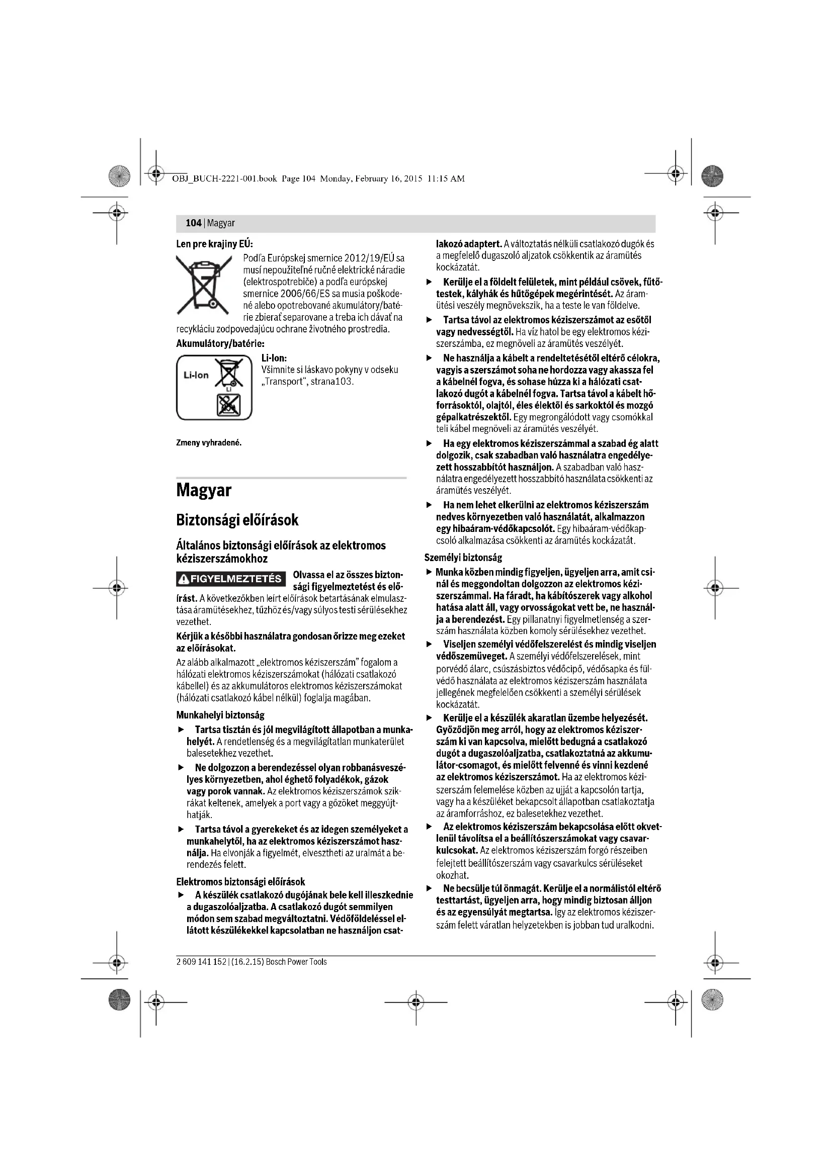 OBJ_BUCH-2221-001.book Page 103 Monday, February 16, 2015 11:15 AM104 | Magyar 2 609 141 152 | (16.2.15) Bosch Power Tools Len pre krajiny EÚ: Podľa Európskej smernice 2012/19/EÚ sa musí nepoužiteľné ručné elektrické náradie (elektrospotrebiče) a podľa európskej smernice 2006/66/ES sa musia poškode- né alebo opotrebované akumulátory/baté- rie zbierať separovane a treba ich dávať na recykláciu zodpovedajúcu ochrane životného prostredia. Akumulátory/batérie: Li-Ion: Všimnite si láskavo pokyny v odseku „Transport“, strana103. Zmeny vyhradené. Magyar Biztonsági előírások Általános biztonsági előírások az elektromos kéziszerszámokhoz Olvassa el az összes bizton- sági figyelmeztetést és elő- írást. A következőkben leírt előírások betartásának elmulasz- tása áramütésekhez, tűzhöz és/vagy súlyos testi sérülésekhez vezethet. Kérjük a későbbi használatra gondosan őrizze meg ezeket az előírásokat. Az alább alkalmazott „elektromos kéziszerszám” fogalom a hálózati elektromos kéziszerszámokat (hálózati csatlakozó kábellel) és az akkumulátoros elektromos kéziszerszámokat (hálózati csatlakozó kábel nélkül) foglalja magában. Munkahelyi biztonság Tartsa tisztán és jól megvilágított állapotban a munka- helyét. A rendetlenség és a megvilágítatlan munkaterület balesetekhez vezethet. Ne dolgozzon a berendezéssel olyan robbanásveszé- lyes környezetben, ahol éghető folyadékok, gázok vagy porok vannak. Az elektromos kéziszerszámok szik- rákat keltenek, amelyek a port vagy a gőzöket meggyújt- hatják. Tartsa távol a gyerekeket és az idegen személyeket a munkahelytől, ha az elektromos kéziszerszámot hasz- nálja. Ha elvonják a figyelmét, elvesztheti az uralmát a be- rendezés felett. Elektromos biztonsági előírások A készülék csatlakozó dugójának bele kell illeszkednie a dugaszolóaljzatba. A csatlakozó dugót semmilyen módon sem szabad megváltoztatni. Védőföldeléssel el- látott készülékekkel kapcsolatban ne használjon csat- lakozó adaptert. A változtatás nélküli csatlakozó dugók és a megfelelő dugaszoló aljzatok csökkentik az áramütés kockázatát. Kerülje el a földelt felületek, mint például csövek, fűtő- testek, kályhák és hűtőgépek megérintését. Az áram- ütési veszély megnövekszik, ha a teste le van földelve. Tartsa távol az elektromos kéziszerszámot az esőtől vagy nedvességtől. Ha víz hatol be egy elektromos kézi- szerszámba, ez megnöveli az áramütés veszélyét. Ne használja a kábelt a rendeltetésétől eltérő célokra, vagyis a szerszámot soha ne hordozza vagy akassza fel a kábelnél fogva, és sohase húzza ki a hálózati csat- lakozó dugót a kábelnél fogva. Tartsa távol a kábelt hő- forrásoktól, olajtól, éles élektől és sarkoktól és mozgó gépalkatrészektől. Egy megrongálódott vagy csomókkal teli kábel megnöveli az áramütés veszélyét. Ha egy elektromos kéziszerszámmal a szabad ég alatt dolgozik, csak szabadban való használatra engedélye- zett hosszabbítót használjon. A szabadban való hasz- nálatra engedélyezett hosszabbító használata csökkenti az áramütés veszélyét. Ha nem lehet elkerülni az elektromos kéziszerszám nedves környezetben való használatát, alkalmazzon egy hibaáram-védőkapcsolót. Egy hibaáram-védőkap- csoló alkalmazása csökkenti az áramütés kockázatát. Személyi biztonság Munka közben mindig figyeljen, ügyeljen arra, amit csi- nál és meggondoltan dolgozzon az elektromos kézi- szerszámmal. Ha fáradt, ha kábítószerek vagy alkohol hatása alatt áll, vagy orvosságokat vett be, ne használ- ja a berendezést. Egy pillanatnyi figyelmetlenség a szer- szám használata közben komoly sérülésekhez vezethet. Viseljen személyi védőfelszerelést és mindig viseljen védőszemüveget. A személyi védőfelszerelések, mint porvédő álarc, csúszásbiztos védőcipő, védősapka és fül- védő használata az elektromos kéziszerszám használata jellegének megfelelően csökkenti a személyi sérülések kockázatát. Kerülje el a készülék akaratlan üzembe helyezését. Győződjön meg arról, hogy az elektromos kéziszer- szám ki van kapcsolva, mielőtt bedugná a csatlakozó dugót a dugaszolóaljzatba, csatlakoztatná az akkumu- látor-csomagot, és mielőtt felvenné és vinni kezdené az elektromos kéziszerszámot. Ha az elektromos kézi- szerszám felemelése közben az ujját a kapcsolón tartja, vagy ha a készüléket bekapcsolt állapotban csatlakoztatja az áramforráshoz, ez balesetekhez vezethet. Az elektromos kéziszerszám bekapcsolása előtt okvet- lenül távolítsa el a beállítószerszámokat vagy csavar- kulcsokat. Az elektromos kéziszerszám forgó részeiben felejtett beállítószerszám vagy csavarkulcs sérüléseket okozhat. Ne becsülje túl önmagát. Kerülje el a normálistól eltérő testtartást, ügyeljen arra, hogy mindig biztosan álljon és az egyensúlyát megtartsa. Így az elektromos kéziszer- szám felett váratlan helyzetekben is jobban tud uralkodni. FIGYELMEZTETÉS OBJ_BUCH-2221-001.book Page 104 Monday, February 16, 2015 11:15 AMMagyar | 105 Bosch Power Tools 2 609 141 152 | (16.2.15) Viseljen megfelelő ruhát. Ne viseljen bő ruhát vagy ék- szereket. Tartsa távol a haját, a ruháját és a kesztyűjét a mozgó részektől. A bő ruhát, az ékszereket és a hosszú hajat a mozgó alkatrészek magukkal ránthatják. Ha az elektromos kéziszerszámra fel lehet szerelni a por elszívásához és összegyűjtéséhez szükséges berendezéseket, ellenőrizze, hogy azok megfelelő mó- don hozzá vannak kapcsolva a készülékhez és rendel- tetésüknek megfelelően működnek. A porgyűjtő beren- dezések használata csökkenti a munka során keletkező por veszélyes hatását. Az elektromos kéziszerszámok gondos kezelése é