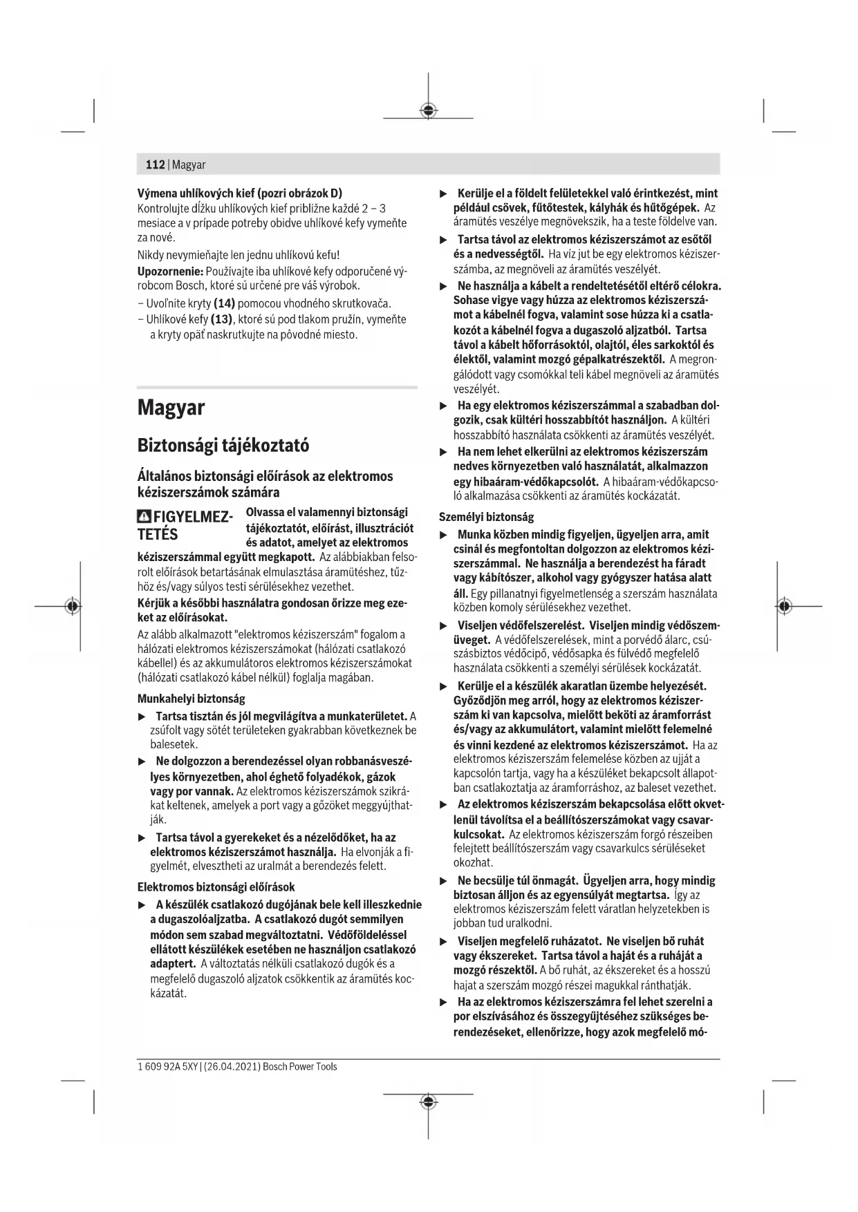 M6 2.71 3.61 4.52 4.8 5.42 6.02 7.22 8.13 9.7 13.6 16.2 M8 6.57 8.7 11 11.6 13.1 14.6 17.5 19.7 23 33 39 M10 13 17.5 22 23 26 29 35 39 47 65 78 M12 22.6 30 37.6 40 45 50 60 67 80 113 135 M14 36 48 60 65 72 79 95 107 130 180 215 M16 55 73 92 98 110 122 147 165 196 275 330 1 609 92A 5XY | (26.04.2021) Bosch Power ToolsSlovenčina | 111 Tipy Pred skrutkovaním väčších adlhších skrutiek do tvrdých materiálov by ste mali vrtákom spriemerom rovným jadru závitu skrutky predvŕtať otvor do 2/3 dĺžky skrutky. Upozornenie: Dávajte pozor na to, aby sa do elektrického náradia nedostali drobné kovové predmety. Spona na opasok Pomocou spony na opasok si môžete zavesiť elektrické nára- die napr. na opasok. Vtakom prípade budete mať obe ruky voľné aelektrické náradie budete mať stále vpohotovosti. Pokyny na optimálne zaobchádzanie sakumulátorom Chráňte akumulátor pred vlhkosťou avodou. Akumulátor skladujte iba pri teplote vrozsahu od –20°C do 50°C. Nenechávajte akumulátor napríklad vlete položený vautomobile. Príležitostne vyčistite vetracie štrbiny akumulátora čistým, mäkkým asuchým štetcom. Výrazne skrátená doba prevádzky akumulátora po nabití sig- nalizuje, že akumulátor je opotrebovaný atreba ho vymeniť za nový. Dodržiavajte upozornenia týkajúce sa likvidácie. Údržba aservis Údržba ačistenie u Pred všetkými prácami na elektrickom náradí (naprí- klad údržba, výmena nástroja apodobne), ako aj pri jeho preprave auskladnení vyberte akumulátor zelektrického náradia. Vprípade neúmyselného aktivo- vania vypínača hrozí nebezpečenstvo poranenia. u Elektrické náradie ajeho vetracie štrbiny udržiavajte vždy včistote, aby ste mohli pracovať dobre abezpeč- ne. Výmena uhlíkových kief (pozriobrázokD) Kontrolujte dĺžku uhlíkových kief približne každé 2 – 3 mesiace avprípade potreby obidve uhlíkové kefy vymeňte za nové. Nikdy nevymieňajte len jednu uhlíkovú kefu! Upozornenie: Používajte iba uhlíkové kefy odporučené vý- robcom Bosch, ktoré sú určené pre váš výrobok. – Uvoľnite kryty (14) pomocou vhodného skrutkovača. – Uhlíkové kefy (13), ktoré sú pod tlakom pružín, vymeňte akryty opäť naskrutkujte na pôvodné miesto. Zákaznícka služba aporadenstvo ohľadom použitia Servisné stredisko Vám odpovie na otázky týkajúce sa opravy aúdržby Vášho produktu ako aj náhradných dielov. Rozkladové výkresy ainformácie onáhradných dieloch náj- dete tiež na: www.bosch-pt.com Vprípade otázok týkajúcich sa našich výrobkov apríslušen- stva Vám ochotne pomôže poradenský tím Bosch. Vprípade akýchkoľvek otázok aobjednávok náhradných dielov uvádzajte bezpodmienečne 10‑miestne vecné číslo uvedené na typovom štítku výrobku. Slovakia Na www.bosch-pt.sk si môžete objednať opravu vášho stroja alebo náhradné diely online. Tel.: +421 2 48 703 800 Fax: +421 2 48 703 801 E-Mail: servis.naradia@sk.bosch.com www.bosch-pt.sk Ďalšie adresy servisov nájdete na: www.bosch-pt.com/serviceaddresses Transport Priložené lítiovo-iónové akumulátory podliehajú požiadav- kám na transport nebezpečného nákladu. Tieto akumulátory smie používateľ náradia prepravovať po cestách bez ďalších opatrení. Pri zasielaní tretími osobami (napr.: leteckou dopravou alebo prostredníctvom špedície) treba rešpektovať osobitné požiadavky na obaly aoznačenie. Vtakomto prípade treba pri príprave zásielky bezpodmienečne konzultovať sodborní- kom na prepravu nebezpečného tovaru. Akumulátory zasielajte iba vtedy, ak nemajú poškodený obal. Otvorené kontakty prelepte aakumulátor zabaľte tak, aby sa vobale nemohol posúvať. Rešpektujte aj prípadné doplňujú- ce národné predpisy. Likvidácia Ručné elektrické náradie, príslušenstvo a obal treba dať na recykláciu zodpovedajúcu ochrane životného prostredia. Neodhadzujte ručné elektrické náradie ani aku- mulátory/batérie do komunálneho odpadu! Len pre krajinyEÚ: Podľa Európskej smernice 2012/19/EÚ sa musí nepoužiteľ- né elektrické náradie apodľa európskej smernice 2006/66/ ES sa musia poškodené alebo opotrebované akumulátory/ batérie zbierať separovane atreba ich dávať na recykláciu vsúlade sochranou životného prostredia. Akumulátory/batérie: Li-Ion: Dodržujte pokyny uvedené včasti Transport (pozri „Trans- port“, Stránka111). Údržba ačistenie u Pred všetkými prácami na elektrickom náradí (naprí- klad údržba, výmena nástroja apodobne), ako aj pri jeho preprave auskladnení vyberte akumulátor zelektrického náradia. Vprípade neúmyselného aktivo- vania vypínača hrozí nebezpečenstvo poranenia. u Elektrické náradie ajeho vetracie štrbiny udržiavajte vždy včistote, aby ste mohli pracovať dobre abezpeč- ne. Bosch Power Tools 1 609 92A 5XY | (26.04.2021)112 | Magyar Výmena uhlíkových kief (pozriobrázokD) Kontrolujte dĺžku uhlíkových kief približne každé 2 – 3 mesiace avprípade potreby obidve uhlíkové kefy vymeňte za nové. Nikdy nevymieňajte len jednu uhlíkovú kefu! Upozornenie: Používajte iba uhlíkové kefy odporučené vý- robcom Bosch, ktoré sú určené pre váš výrobok. – Uvoľnite kryty (14) pomocou vhodného skrutkovača. – Uhlíkové kefy (13), ktoré sú pod tlakom pružín, vymeňte akryty opäť naskrutkujte na pôvodné miesto. Magyar Biztonsági tájékoztató Általános biztonsági előírások az elektromos kéziszerszámok számára FIGYELMEZ- TETÉS Olvassa el valamennyi biztonsági tájékoztatót, előírást, illusztrációt és adatot, amelyet az elektromos kéziszerszámmal együtt megkapott. Az alábbiakban felso- rolt előírások betartásának elmulasztása áramütéshez, tűz- höz és/vagy súlyos testi sérülésekhez vezethet. Kérjük a későbbi használatra gondosan őrizze meg eze- ket az előírásokat. Az alább alkalmazott "elektro