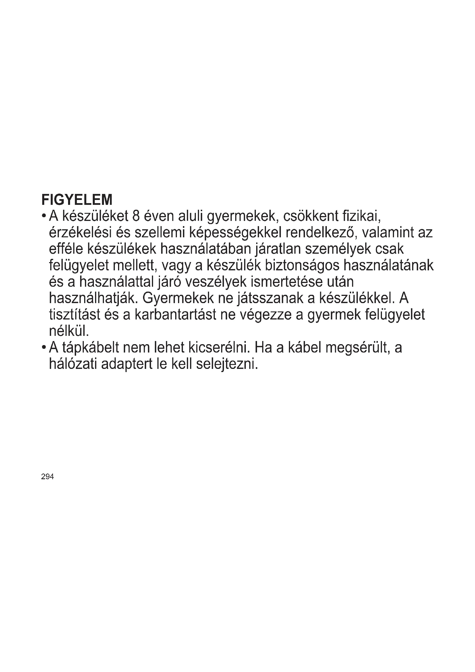 A készüléket 8 éven aluli gyermekek, csökkent zikai, érzékelési és szellemi képességekkel rendelkező, valamint az efféle készülékek használatában járatlan személyek csak felügyelet mellett, vagy a készülék biztonságos használatának és a használattal járó veszélyek ismertetése után használhatják. Gyermekek ne játsszanak a készülékkel. A tisztítást és a karbantartást ne végezze a gyermek felügyelet nélkül.
