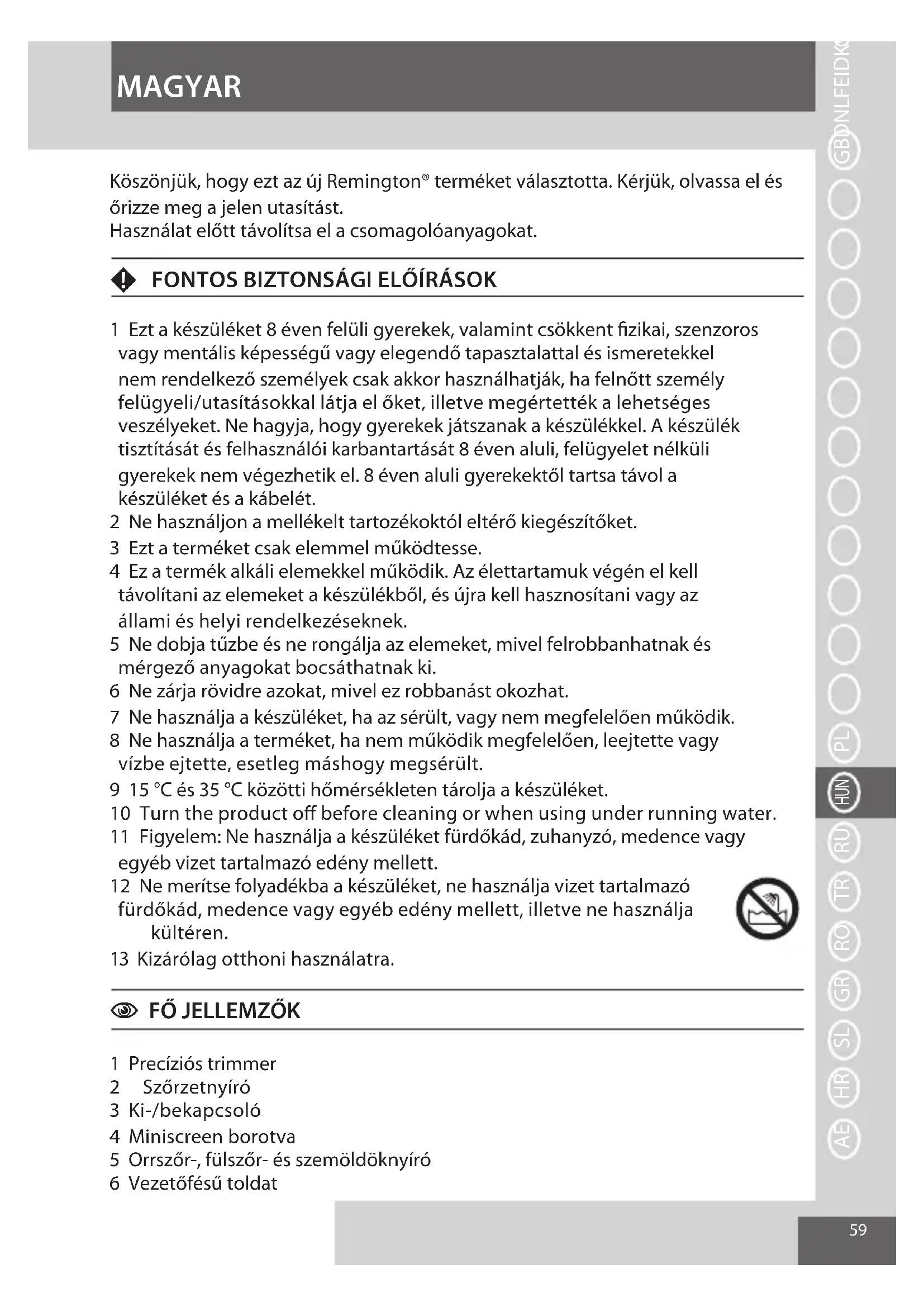 Aby uniknąć zagrożeń dla środowiska i zdrowia ze względu na niebezpieczne substancje znajdujące się w komponentach elektrycznych i elektronicznych, urządzeń oznaczonych tym symbolem nie wyrzucaj wraz z niesortowanymi odpadami komunalnymi - składniki urządzenia mogą być ponownie wykorzystane lub poddane recyklingowi. POLSKI59 Köszönjük, hogy ezt az új Remington® terméket választotta. Kérjük, olvassa el és őrizze meg a jelen utasítást. Használat előtt távolítsa el a csomagolóanyagokat. F FONTOS BIZTONSÁGI ELŐÍRÁSOK 1 Ezt a készüléket 8 éven felüli gyerekek, valamint csökkent zikai, szenzoros vagy mentális képességű vagy elegendő tapasztalattal és ismeretekkel nem rendelkező személyek csak akkor használhatják, ha felnőtt személy felügyeli/utasításokkal látja el őket, illetve megértették a lehetséges veszélyeket. Ne hagyja, hogy gyerekek játszanak a készülékkel. A készülék tisztítását és felhasználói karbantartását 8 éven aluli, felügyelet nélküli gyerekek nem végezhetik el. 8 éven aluli gyerekektől tartsa távol a készüléket és a kábelét. 2 Ne használjon a mellékelt tartozékoktól eltérő kiegészítőket. 3 Ezt a terméket csak elemmel működtesse. 4 Ez a termék alkáli elemekkel működik. Az élettartamuk végén el kell távolítani az elemeket a készülékből, és újra kell hasznosítani vagy az állami és helyi rendelkezéseknek. 5 Ne dobja tűzbe és ne rongálja az elemeket, mivel felrobbanhatnak és mérgező anyagokat bocsáthatnak ki. 6 Ne zárja rövidre azokat, mivel ez robbanást okozhat. 7 Ne használja a készüléket, ha az sérült, vagy nem megfelelően működik. 8 Ne használja a terméket, ha nem működik megfelelően, leejtette vagy vízbe ejtette, esetleg máshogy megsérült. 9 15 °C és 35 °C közötti hőmérsékleten tárolja a készüléket. 10 Turn the product o before cleaning or when using under running water. 11 Figyelem: Ne használja a készüléket fürdőkád, zuhanyzó, medence vagy egyéb vizet tartalmazó edény mellett. 12 Ne merítse folyadékba a készüléket, ne használja vizet tartalmazó fürdőkád, medence vagy egyéb edény mellett, illetve ne használja kültéren. 13 Kizárólag otthoni használatra.