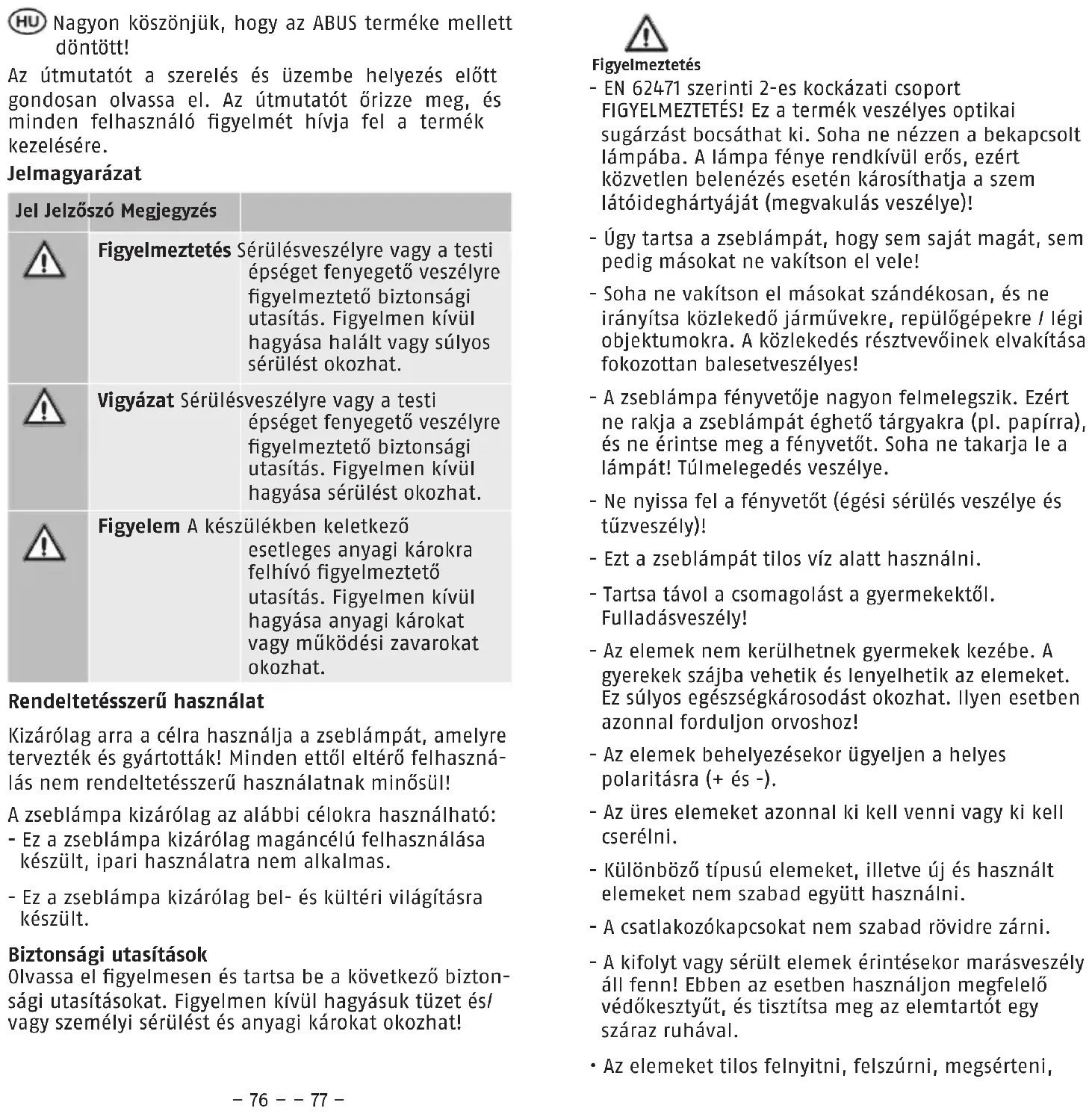 intenzitu > vypnutie. Keď batérie zoslabnú, svetlo začne mihotať a zníži sa jeho intenzita. Batérie hneď vymeňte za 2 nové 1,5 V alkalické batérie AA. Odporúčame používať kvalitné značkové batérie, napr. Panasonic, Varta alebo Duracell. Technické údaje Typ batérií 2x 1,5 V alkalické AA Trieda ochrany IP44 Režim intenzívny / menej intenzívny / vypnuté Trvanie svietenia 200 lumenov: cca 3 h, 40 lumenov: cca 7 h Max. dosah 150 m Teplota skladovania +10°C až +35°C Rozsah prevádzkovej teploty -20°C až +40°C Materiál hliník a PC Rozmery cca 149 x 19 x 26,5 mm Hmotnosť netto cca 95 g (bez batérií) Vyhlásenie o zhode Spoločnosť ABUS August Bremicker Söhne KG týmto vyhlasuje, že zariadenie TL-515 zodpovedá požia- davkám smerníc 2014/30/EÚ a 2011/65/EÚ. Úplné znenie vyhlásenia o zhode EÚ je dostupné na nasledujúcej internetovej adrese info@abus.de Likvidácia Obal likvidujte triedene. Lepenku a kartón dajte do zberového papiera, fólie a plastové diely do zberu recyklovateľných materiálov. Tento výrobok obsahuje cenné suroviny. Na konci životnosti výrobku ho zlikvidujte podľa platných zákonných ustanovení. Elektrické zariadenia, akumulátory a batérie sa nesmú likvidovať s bežným domovým odpadom. Musia sa zlikvidovať podľa smernice 2012/19/ EÚ o odpade z elektrických a elektronických zariadení (OEEZ), resp. podľa smernice 2006/66/ES o batériách a akumulátoroch a použitých batériách a akumulátoroch. Pred likvidáciou elektrických prístrojov sa z nich musia odstrániť batérie, ktoré sa zlikvidujú samostatne. S otázkami sa obráťte na komunálny orgán zodpovedný za likvidáciu. Informácie o zberných miestach pre staré zariadenia vám poskytne napr. miestna obecná, resp. mestská správa, miestna spoločnosť na likvidáciu odpadu alebo váš špecializovaný predajca. Záruka Výrobky spoločnosti ABUS sú skoncipované, vyrobené s najväčšou starostlivosťou a skontrolované podľa platných predpisov. Záruka sa vzťahuje výlučne na nedostatky, ktorých pôvodom je chyba materiálu alebo výrobná chyba. Pokiaľ je možné dokázať chybu materiálu alebo výrobnú chybu, spoločnosť ABUS po posúdení výrobok opraví alebo vymení. Záruka končí v týchto prípadoch uplynutím pôvodnej záručnej doby. Ďalšie nároky sú výslovne vylúčené. Spoločnosť ABUS neručí za nedostatky a poškodenia, ktoré vznikli vonkajšími vplyvmi (napr. prepravou, násilným pôsobením), neodbornou obsluhou, normálnym opotrebovaním a nedodržiavaním tohto návodu. Pri uplatňovaní nároku na záruku je potrebné k reklamovanému výrobku priložiť originálny doklad o nákupe s dátumom nákupu a krátky písomný popis chyby. Technické zmeny vyhradené. Za tlačové chyby a omyly nezodpovedáme WEEE-Reg.-Nr. DE79663011– 76 – – 77 – Nagyon köszönjük, hogy az ABUS terméke mellett döntött! Az útmutatót a szerelés és üzembe helyezés előtt gondosan olvassa el. Az útmutatót őrizze meg, és minden felhasználó gyelmét hívja fel a termék kezelésére. Jel Jelzőszó Megjegyzés Figyelmeztetés Sérülésveszélyre vagy a testi épséget fenyegető veszélyre gyelmeztető biztonsági utasítás. Figyelmen kívül hagyása halált vagy súlyos sérülést okozhat. Vigyázat Sérülésveszélyre vagy a testi épséget fenyegető veszélyre gyelmeztető biztonsági utasítás. Figyelmen kívül hagyása sérülést okozhat. Figyelem A készülékben keletkező esetleges anyagi károkra felhívó gyelmeztető utasítás. Figyelmen kívül hagyása anyagi károkat vagy működési zavarokat okozhat. Jelmagyarázat Rendeltetésszerű használat Kizárólag arra a célra használja a zseblámpát, amelyre tervezték és gyártották! Minden ettől eltérő felhaszná- lás nem rendeltetésszerű használatnak minősül! A zseblámpa kizárólag az alábbi célokra használható: - Ez a zseblámpa kizárólag magáncélú felhasználása készült, ipari használatra nem alkalmas. - Ez a zseblámpa kizárólag bel- és kültéri világításra készült. Biztonsági utasítások Olvassa el gyelmesen és tartsa be a következő bizton- sági utasításokat. Figyelmen kívül hagyásuk tüzet és/ vagy személyi sérülést és anyagi károkat okozhat! - EN 62471 szerinti 2-es kockázati csoport FIGYELMEZTETÉS! Ez a termék veszélyes optikai sugárzást bocsáthat ki. Soha ne nézzen a bekapcsolt lámpába. A lámpa fénye rendkívül erős, ezért közvetlen belenézés esetén károsíthatja a szem látóideghártyáját (megvakulás veszélye)! - Úgy tartsa a zseblámpát, hogy sem saját magát, sem pedig másokat ne vakítson el vele! - Soha ne vakítson el másokat szándékosan, és ne irányítsa közlekedő járművekre, repülőgépekre / légi objektumokra. A közlekedés résztvevőinek elvakítása fokozottan balesetveszélyes! - A zseblámpa fényvetője nagyon felmelegszik. Ezért ne rakja a zseblámpát éghető tárgyakra (pl. papírra), és ne érintse meg a fényvetőt. Soha ne takarja le a lámpát! Túlmelegedés veszélye. - Ne nyissa fel a fényvetőt (égési sérülés veszélye és tűzveszély)! - Ezt a zseblámpát tilos víz alatt használni. - Tartsa távol a csomagolást a gyermekektől. Fulladásveszély! - Az elemek nem kerülhetnek gyermekek kezébe. A gyerekek szájba vehetik és lenyelhetik az elemeket. Ez súlyos egészségkárosodást okozhat. Ilyen esetben azonnal forduljon orvoshoz! - Az elemek behelyezésekor ügyeljen a helyes polaritásra (+ és -). - Az üres elemeket azonnal ki kell venni vagy ki kell cserélni. - Különböző típusú elemeket, illetve új és használt elemeket nem szabad együtt használni. - A csatlakozókapcsokat nem szabad rövidre zárni. - A kifolyt vagy sérült elemek érintésekor marásveszély áll fenn! Ebben az esetben használjon megfelelő védőkesztyűt, és tisztítsa meg az elemtartót 