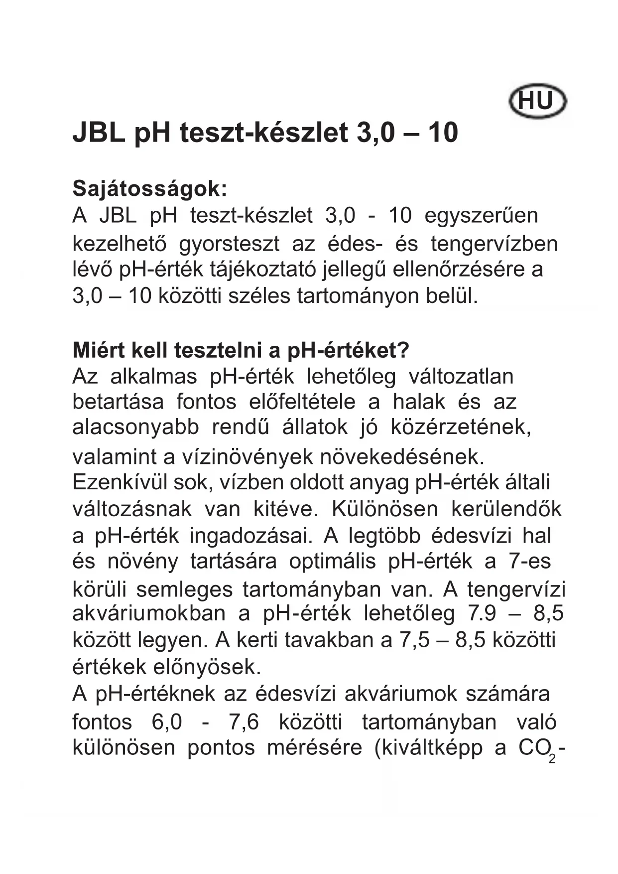 -HU es tápszerezés ellenőrzésére is) a JBL pH- teszt készlet 6,0 – 7,6 alkalmazható. Tengervízi akváriumok és kerti tavak számára a pH-érték pontos mérésére a JBL pH teszt-készlet 7,4-9,0 alkalmazható. Orvoslás a pH-érték eltérésekor: Édesvízi akvárium: pH-érték csökkentése JBL pH-Minus termékkel, de előnyösebb a JBL PROFLORA rendszerrel való