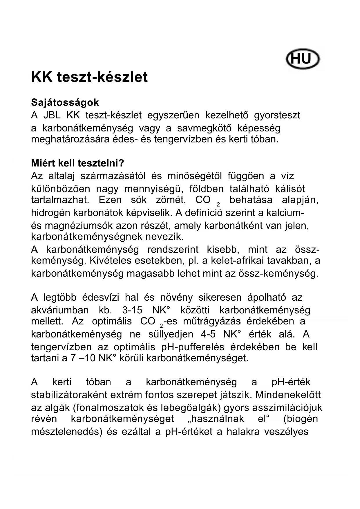 -es műtrágyázás érdekében a karbonátkeménység ne süllyedjen 4-5 NK° érték alá. A tengervízben az optimális pH-pufferelés érdekében be kell tartani a 7 –10 NK° körüli karbonátkeménységet. A kerti tóban a karbonátkeménység a pH-érték stabilizátoraként extrém fontos szerepet játszik. Mindenekelőtt az algák (fonalmoszatok és lebegőalgák) gyors asszimilációjuk révén karbonátkeménységet „használnak el“ (biogén mésztelenedés) és ezáltal a pH-értéket a halakra veszélyesHU magasságra (10 fölé) hajthatják fel. Ezért a kerti tóban legalább 4 NK° értékű karbonátkeménységet kell betartani. Orvoslás kedvezőtlen értékek esetén Vízlágyításra különböző lehetőségek állnak rendelkezésünkre (pl. a JBL Osmose 120 fordított ozmózis berendezés alkalmazásával). Kérjen tanácsot a díszállatkereskedésben. A karbonátkeménység emelésére édesvízi akváriumban a JBL AquaDur plus vagy a JBL pH-Plus, tengervízben a JBL CalciuMarin készítmény szolgál. Kerti tóban a karbonátkeménység a JBL Stabilo Pond KH készítménnyel növelhető. Útmutató