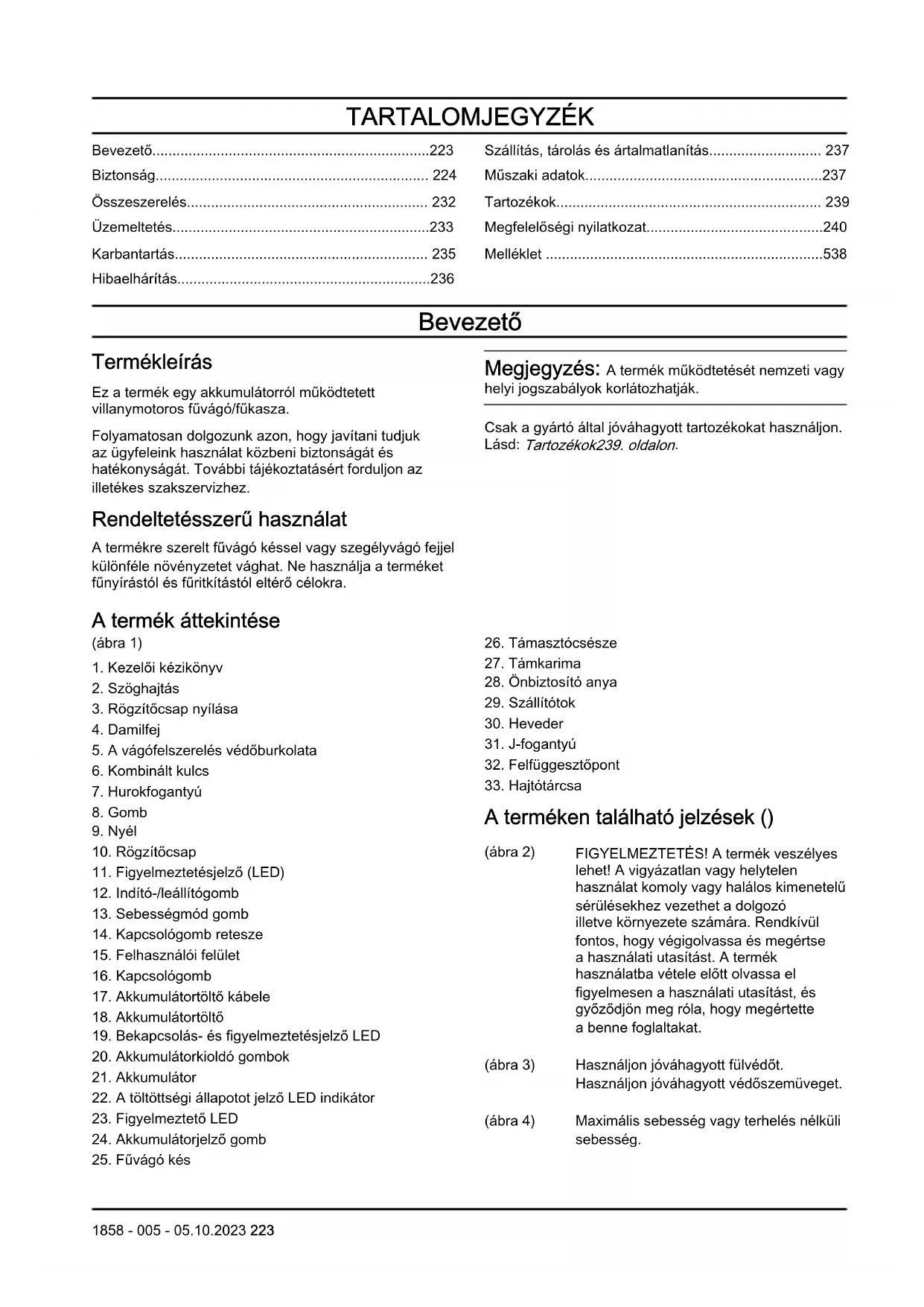 - Melléklet Bevezető Termékleírás Ez a termék egy akkumulátorról működtetett villanymotoros fűvágó/fűkasza. Folyamatosan dolgozunk azon, hogy javítani tudjuk az ügyfeleink használat közbeni biztonságát és hatékonyságát. További tájékoztatásért forduljon az illetékes szakszervizhez. Rendeltetésszerű használat A termékre szerelt fűvágó késsel vagy szegélyvágó fejjel különféle növényzetet vághat. Ne használja a terméket fűnyírástól és fűritkítástól eltérő célokra. Megjegyzés: A termék működtetését nemzeti vagy helyi jogszabályok korlátozhatják. Csak a gyártó által jóváhagyott tartozékokat használjon. Lásd: Tartozékok239. oldalon p. 538
