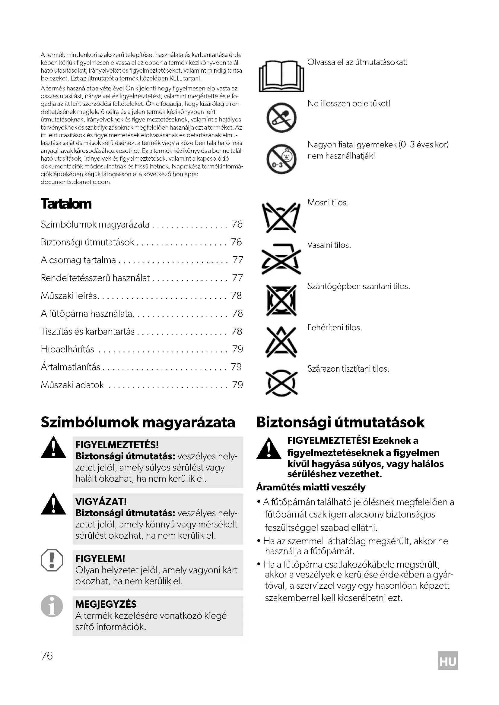 - Ha a fűtőpárna csatlakozókábele megsérült, akkor a veszélyek elkerülése érdekében a gyár- tóval, a szervizzel vagy egy hasonlóan képzett szakemberrel kell kicseréltetni ezt. FIGYELMEZTETÉS! Biztonsági útmutatás: veszélyes hely- zetet jelöl, amely súlyos sérülést vagy halált okozhat, ha nem kerülik el. VIGYÁZAT! Biztonsági útmutatás: veszélyes hely- zetet jelöl, amely könnyű vagy mérsékelt sérülést okozhat, ha nem kerülik el. FIGYELEM! Olyan helyzetet jelöl, amely vagyoni kárt okozhat, ha nem kerülik el. MEGJEGYZÉS A termék kezelésére vonatkozó kiegé- szítő információk. Olvassa el az útmutatásokat!Ne illesszen bele tűket!Nagyon fiatal gyermekek (0–3 éves kor) nem használhatják!Mosni tilos.Vasalni tilos.Szárítógépben szárítani tilos.Fehéríteni tilos.Szárazon tisztítani tilos.77