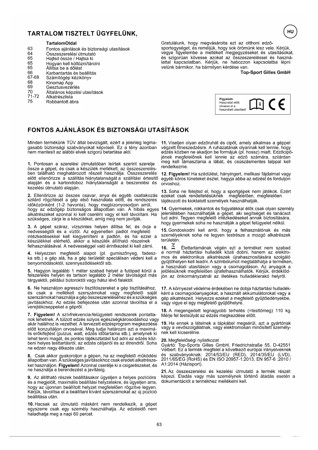 TARTALOM TISZTELT ÜGYFELÜNK, Gratulálunk, hogy megvásárolta ezt az otthoni edző- sportegységet, és reméljük, hogy sok örömünk lesz vele. Kérjük, vegye gyelembe a mellékelt megjegyzéseket és utasításokat, és szigorúan kövesse azokat az összeszereléssel és haszná- lattal kapcsolatban. Kérjük, ne habozzon kapcsolatba lépni velünk bármikor, ha bármilyen kérdése van. Top-Sport Gilles GmbH TartalomOldal Figyelem: Használat előtt olvassa el a használati utasítást! FONTOS AJÁNLÁSOK ÉS BIZTONSÁGI UTASÍTÁSOK Minden termékünk TÜV által bevizsgált, ezért a jelenleg legma- gasabb biztonsági szabványokat képviseli. Ez a tény azonban nem mentesít az alábbi elvek szigorú betartása alól.
